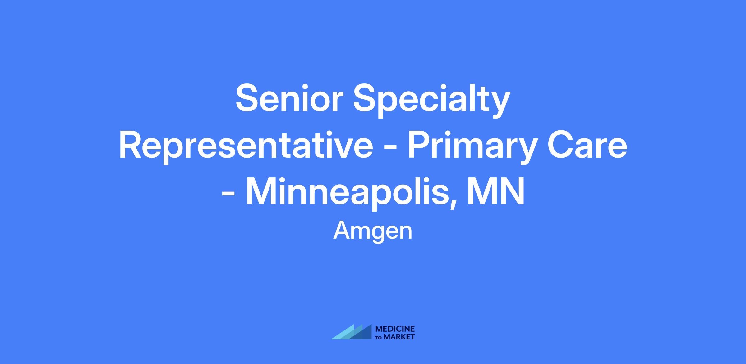 Senior Specialty Representative - Primary Care in Minneapolis, MN. Responsible for providing clinical knowledge of Amgen products to medical professionals, promoting products, and navigating the payer environment. Acts as the primary customer contact and implements marketing strategy under the District Manager’s guidance.