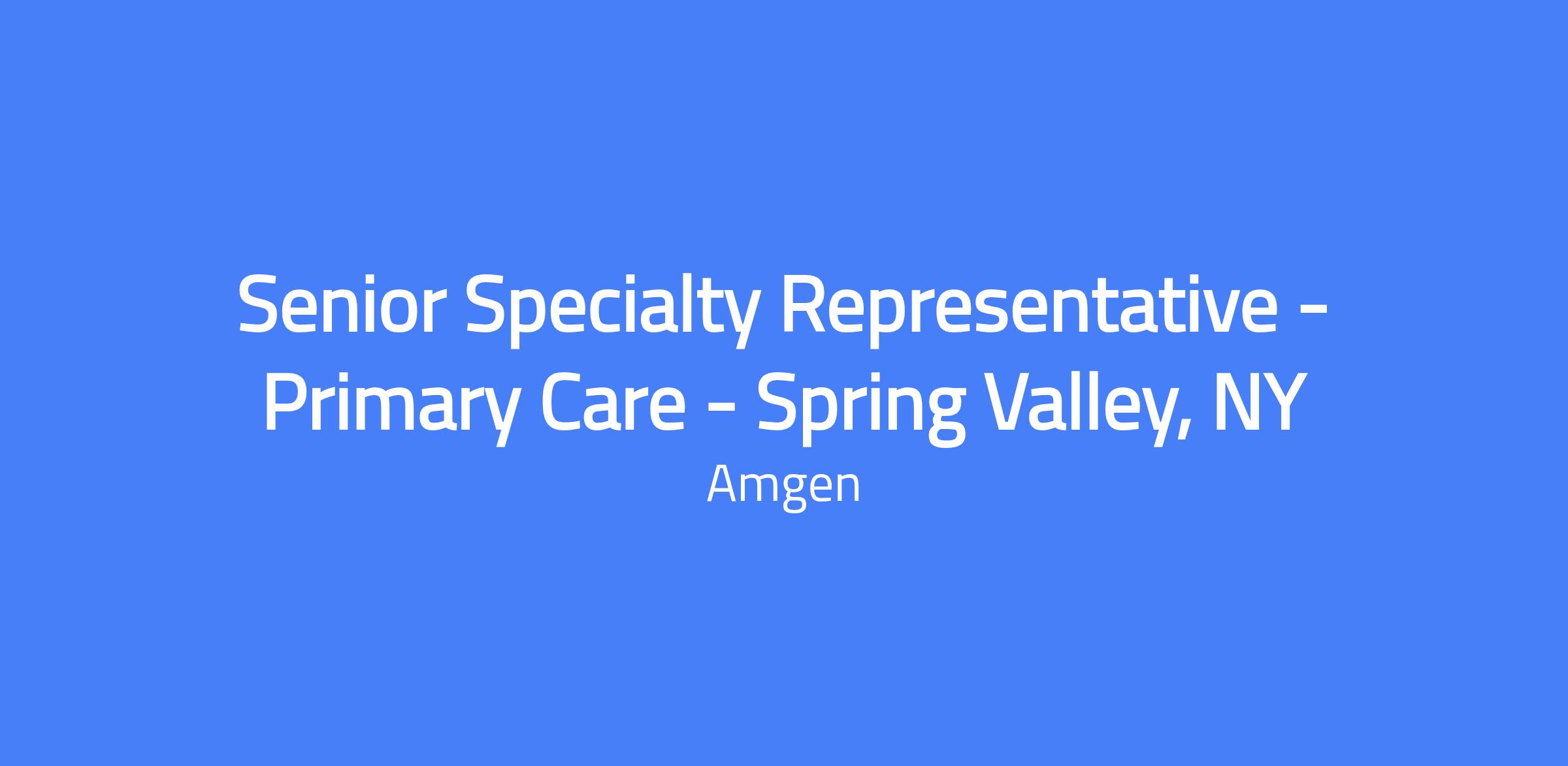 Location: Spring Valley, NY. Territory covers Spring Valley, NY; relocation is not offered for this role. In this Senior Specialty Representative role, you will be the primary customer contact, delivering clinical knowledge of Amgen products to medical professionals and helping them navigate the payer environment. You will implement the marketing strategy as led by the District Manager and promote Amgen products to drive appropriate utilization.