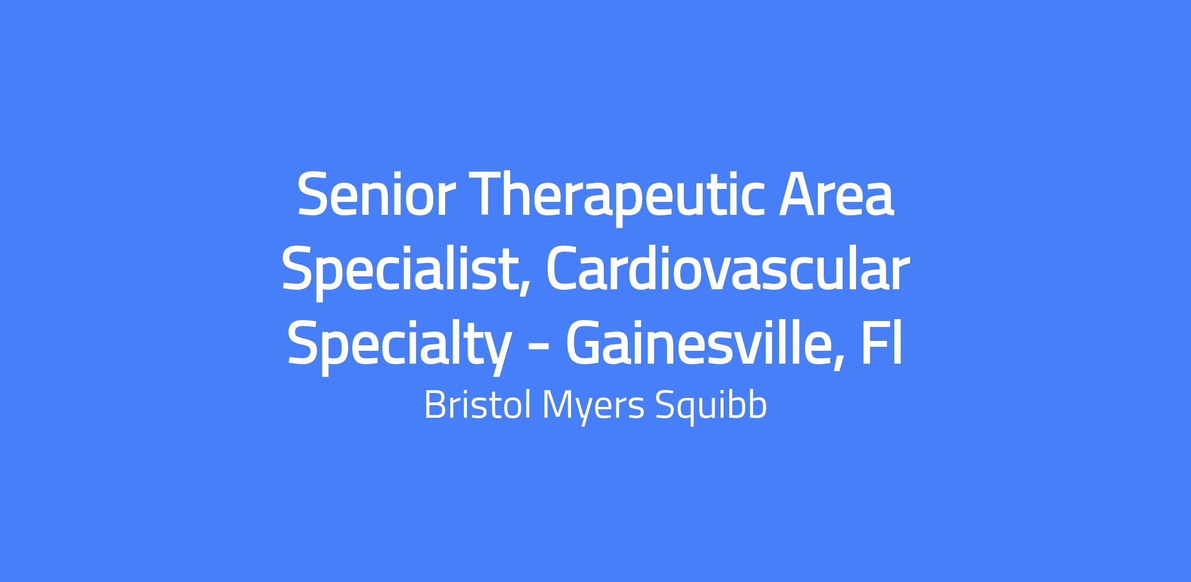 Location: Gainesville, FL. The Senior Therapeutic Area Specialist (Cardiovascular) is a field-based role focused on driving demand for BMS medicines within the cardiovascular portfolio by engaging Health Care Providers (HCPs) with a scientifically grounded, patient-centric Customer Experience (Cx). The TAS builds credibility with regional thought leaders and community-based physicians/HCPs and collaborates with other BMS functions to deliver timely, evidence-based support aligned with label indications and business objectives. The role is field-based, with 100% of time spent in the field with external customers.
