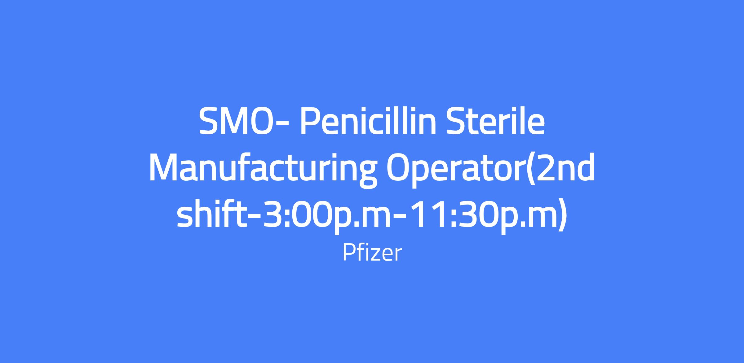 Penicillin Sterile Manufacturing Operator (2nd shift: 3:00 p.m. – 11:30 p.m.) in a Penicillin Facility. You will perform packaging and inspection tasks, support manufacturing operations, and ensure compliance with cGMP and safety standards. This role requires collaboration with supervisors and cross-functional teams to maintain production schedules and quality.