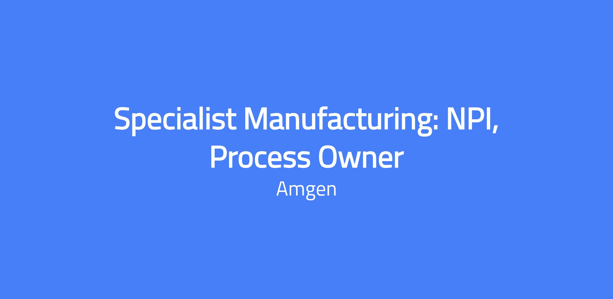 Specialist Manufacturing: NPI, Process Owner. You will act as the interface between GMP manufacturing teams at the Amgen North Carolina Biologics Drug Substance Manufacturing plant and Process Development, owning downstream unit operations and driving tech transfer through cross-functional collaboration.