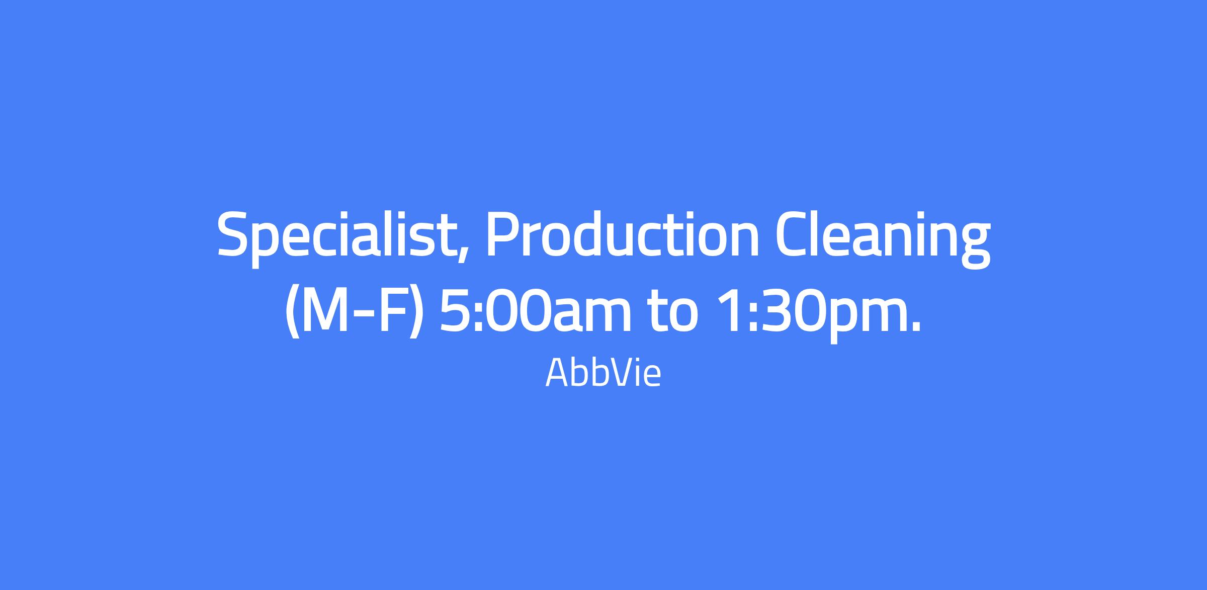 Specialist, Production Cleaning is responsible for performing microbial control cleaning in facilities that manufacture a finished product for sale, or sale to another organization for use in an end product. Cleaning procedures must comply with current Good Manufacturing Practices (cGMP) and regulatory guidelines, with documentation of work procedures frequently audited by the FDA and other regulatory agencies. The work is performed under the general supervision of Lead Personnel and an Area Supervisor.