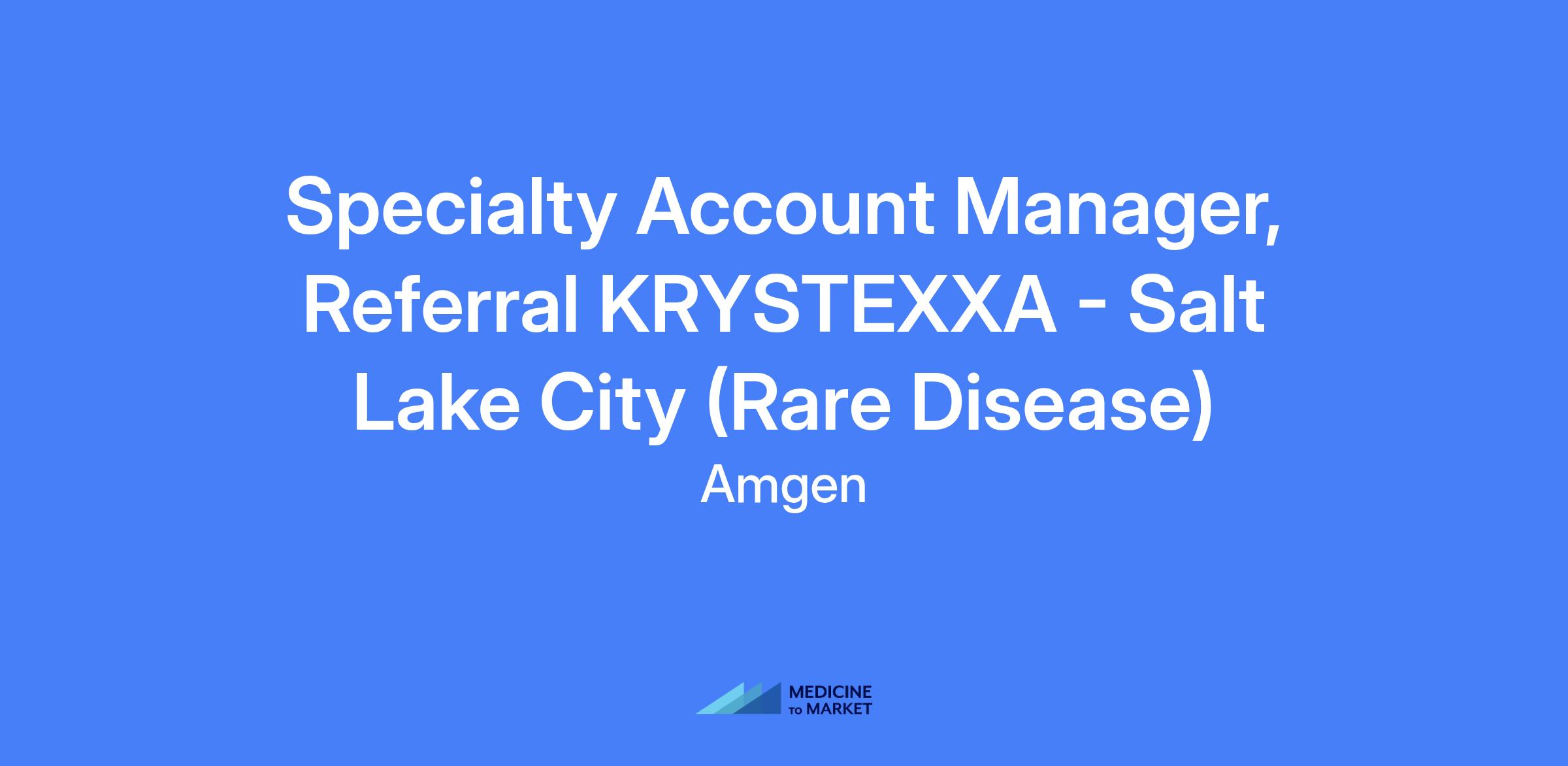 Specialty Account Manager, Referral KRYSTEXXA - Salt Lake City (Rare Disease) – Territory covers Salt Lake City. Represent Amgen's Rare Disease products to Primary Care/FP/GP/IM, Podiatry, and Orthopedic physicians and healthcare professionals; drive Biotech/Infusion product sales, increase referrals to Rheumatology and Nephrology, and perform total territory account management.