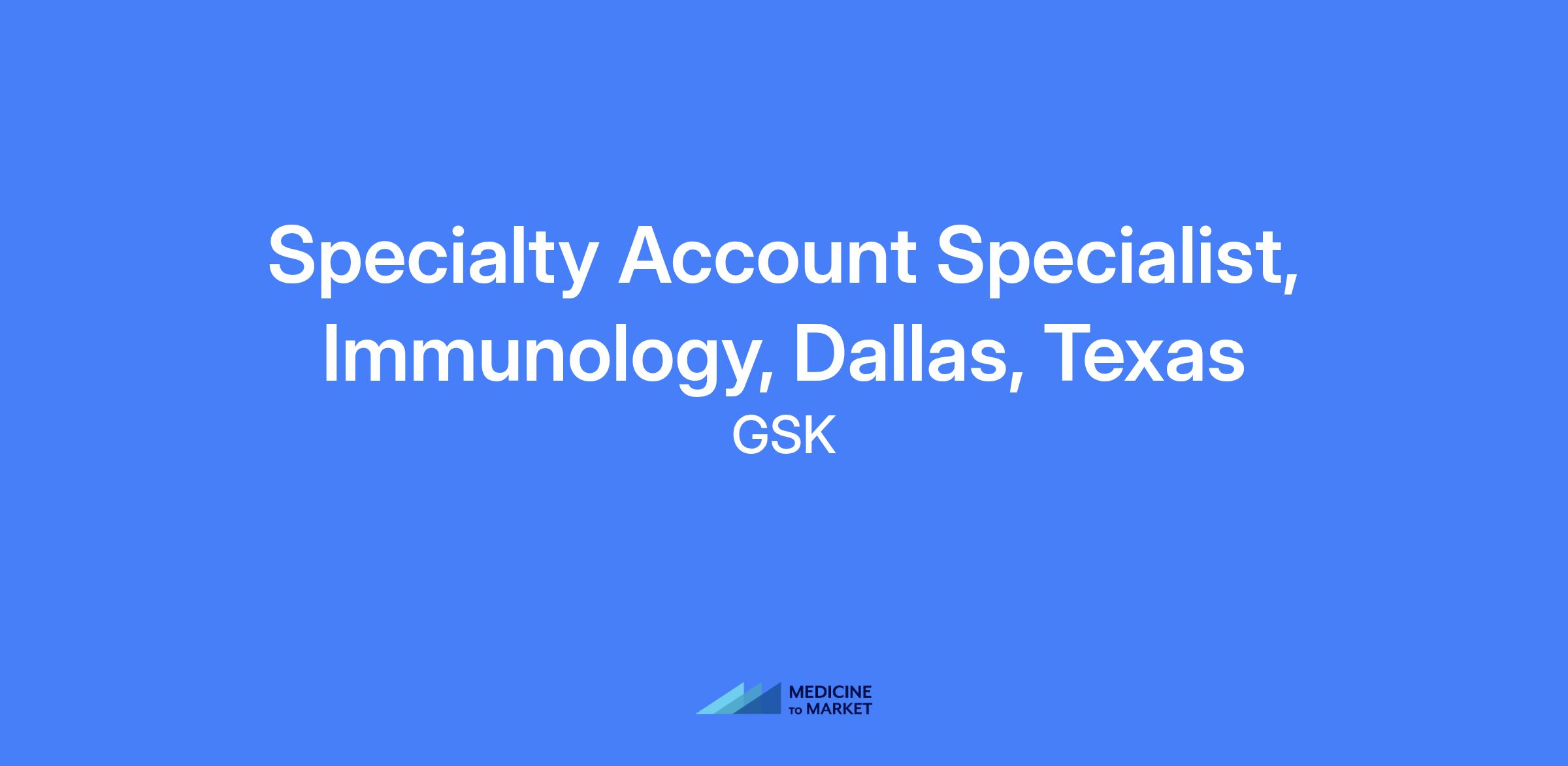 Specialty Account Specialist, Immunology, Dallas, Texas. The role involves providing scientific knowledge, business acumen, and customer engagement to specialist customers in support of a GSK biologic product, managing reimbursement and distribution considerations, and developing account strategies within designated therapeutic areas.
