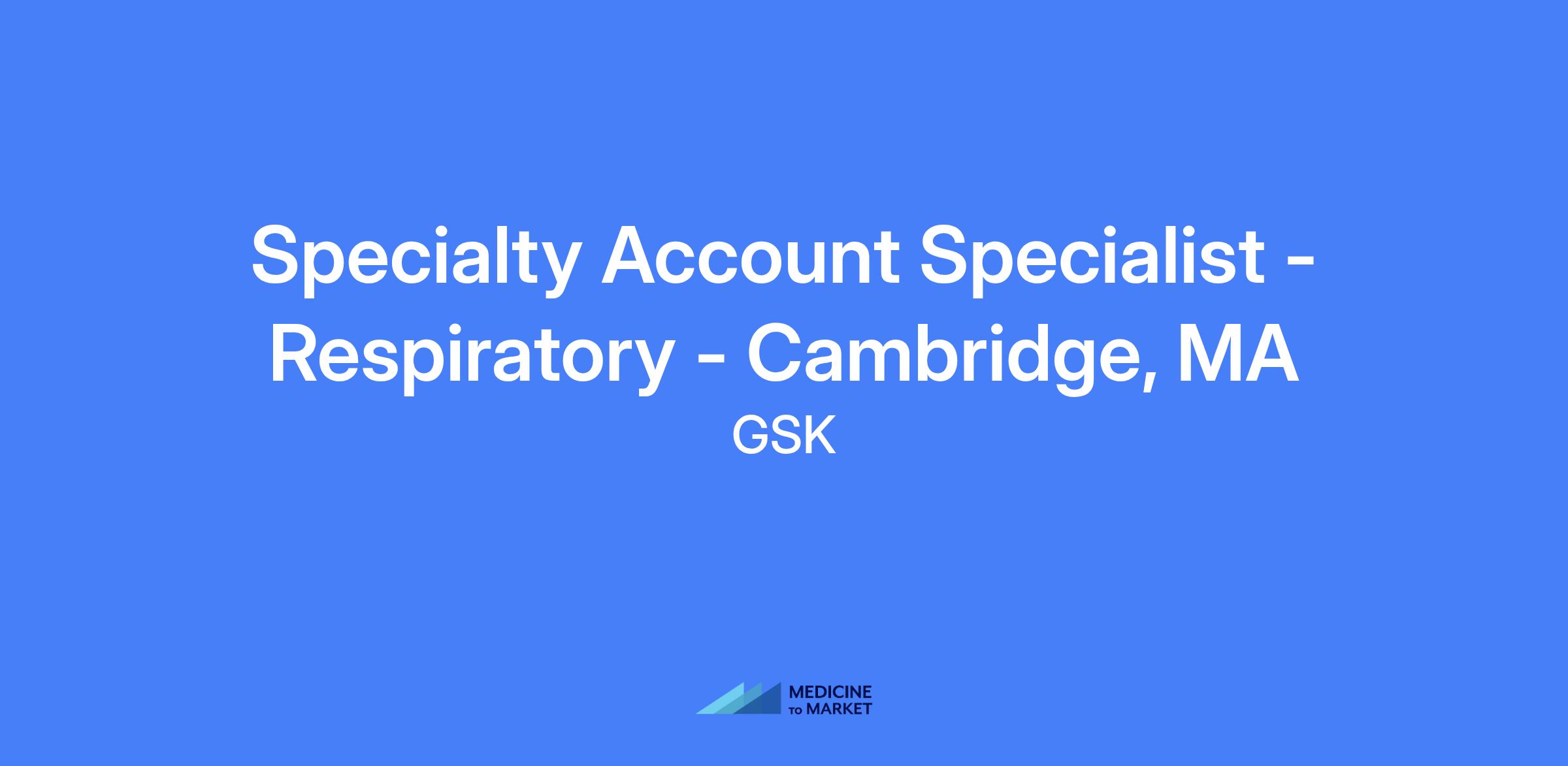 Specialty Account Specialist - Respiratory - Cambridge, MA. This role provides Scientific Knowledge, Business Acumen, and Customer Engagement expertise to specialist customers in support of a GSK biologic product, with emphasis on understanding reimbursement and distribution landscape and delivering product education and strategic account plans.