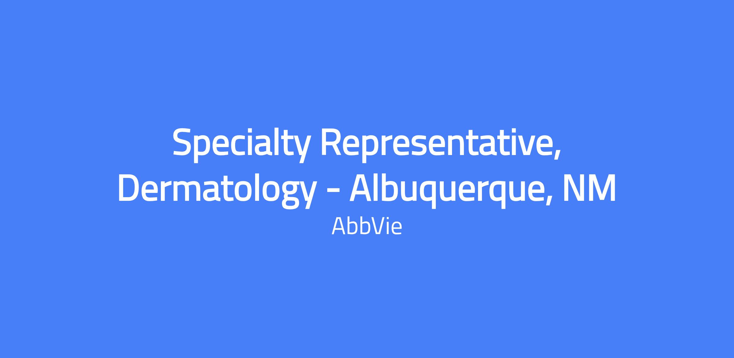 Specialty Representative, Dermatology – Albuquerque, NM. Field-based role covering all of New Mexico with Albuquerque as the primary city; candidates should live within a reasonable distance from the primary city. You will execute brand strategy and tactics, manage the assigned territory and targeted accounts, build strong customer relationships, and solve customer needs to maximize short- and long-term sales while adhering to AbbVie’s code of conduct and applicable laws.