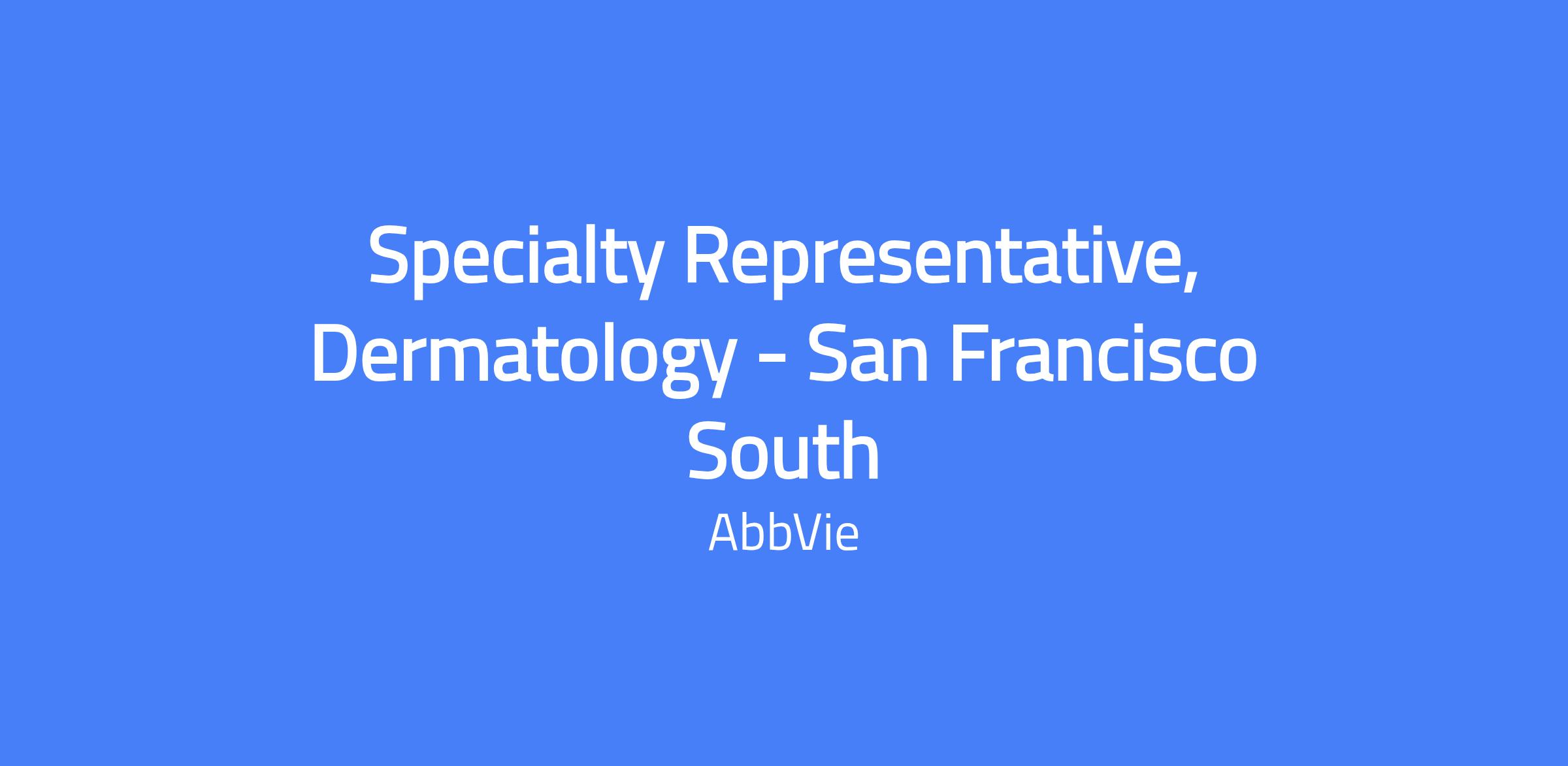 Field-based Specialty Representative, Dermatology covering San Francisco South. This role requires candidates to live within a reasonable distance from the primary city; the geography includes San Jose, Palo Alto, Santa Cruz, Burlingame, Redwood City, Los Gatos, Salinas and surrounding areas. You will execute brand strategy and tactics in the field, manage the assigned territory and targeted accounts, build strong customer relationships and solutions to customer needs in order to maximize short- and long-term sales, while operating within AbbVie's code of conduct, policies and all applicable laws.