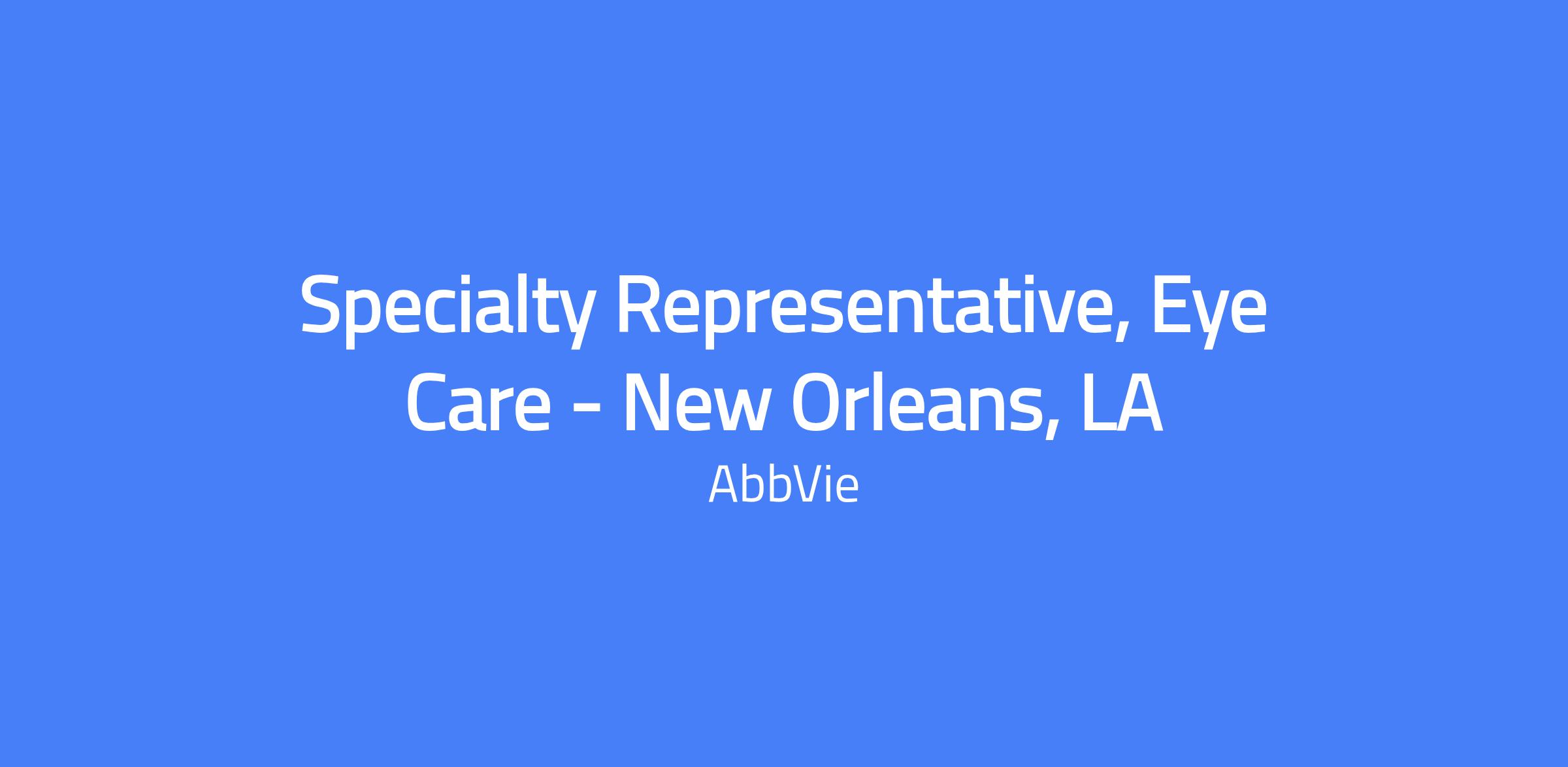 The Specialty Representative, Eye Care role is field-based and based in or near New Orleans, LA. Members will be hired at a level commensurate with experience and will deliver sales performance, manage call plans, build trusted customer relationships, and differentiate AbbVie’s eye care value proposition within their territory.