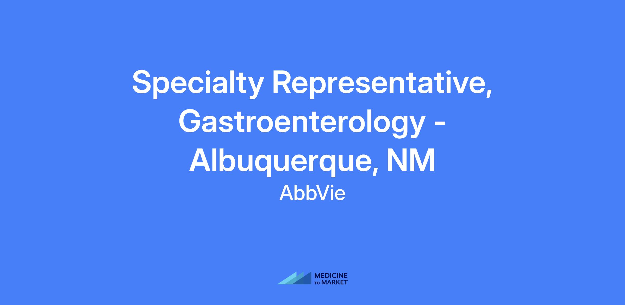 Specialty Representative, Gastroenterology - Albuquerque, NM. Field-based role covering New Mexico and surrounding areas. Responsible for executing brand strategy and tactics in the field, achieving sales performance, managing territory and accounts, building strong customer relationships, and solving customer needs to maximize short and long-term sales performance, while adhering to AbbVie’s code of conduct and all applicable laws and regulations.