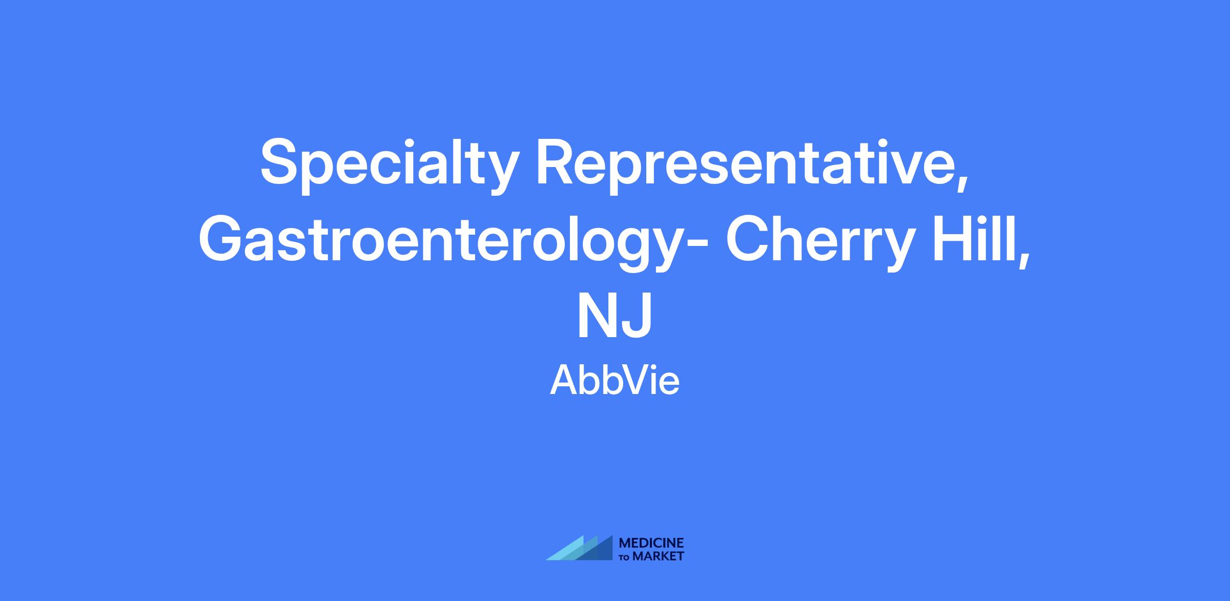 Specialty Representative, Gastroenterology - Cherry Hill, NJ. Field-based role; candidates should live within a reasonable distance from the primary city. Talent will be hired at a level commensurate with experience. Geography covers: Philadelphia, Camden, Atlantic City, Toms River, Lakewood, Vineland, Wilmington, DE.