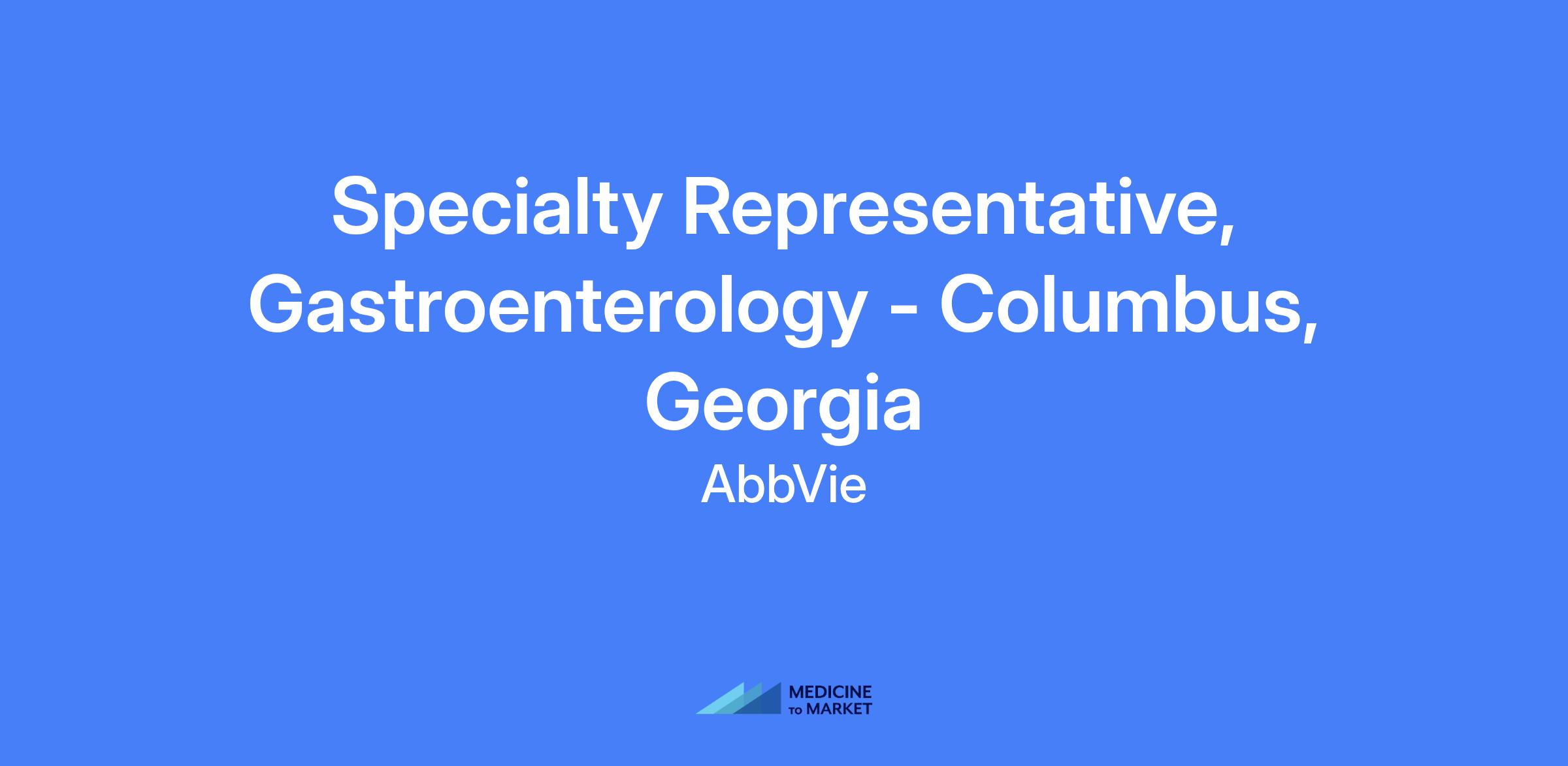 Specialty Representative, Gastroenterology - Columbus, Georgia. Field-based role serving the Columbus area and surrounding markets. Role focuses on executing brand strategy, driving sales performance, and building strong customer relationships in alignment with AbbVie policies and applicable laws.