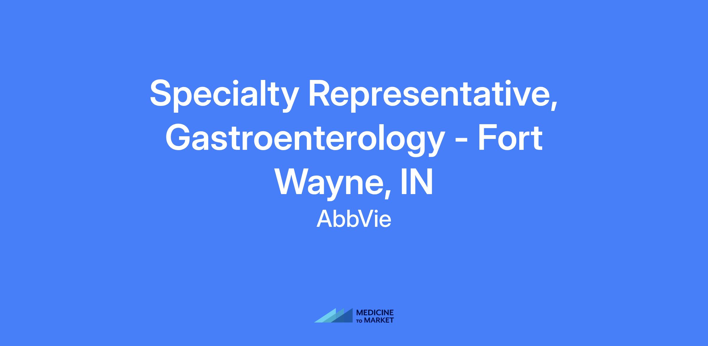 Specialty Representative, Gastroenterology - Fort Wayne, IN. Execute brand strategy and tactics in field, drive sales performance, manage assigned territory and targeted accounts, build strong customer relationships, and solve customer needs to maximize short and long term sales performance with the patient at the center and in compliance with AbbVie’s code of conduct and all applicable laws and regulations.