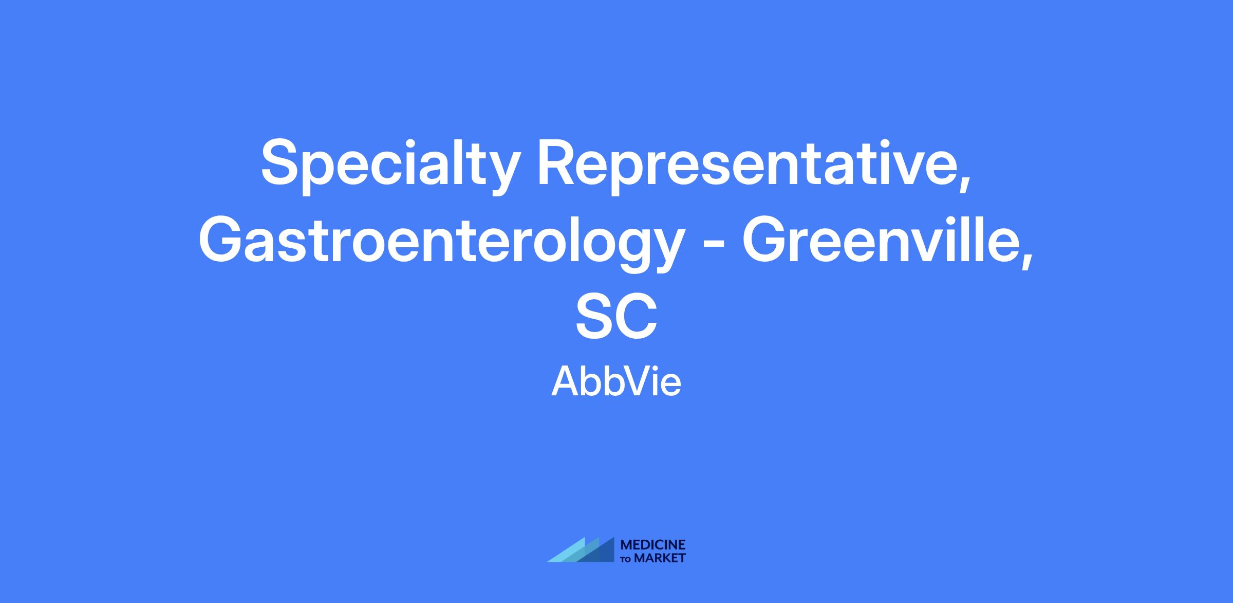 Specialty Representative, Gastroenterology - Greenville, SC. This field-based role covers Greenville, SC and surrounding areas. Talent will be hired at a level commensurate with experience.