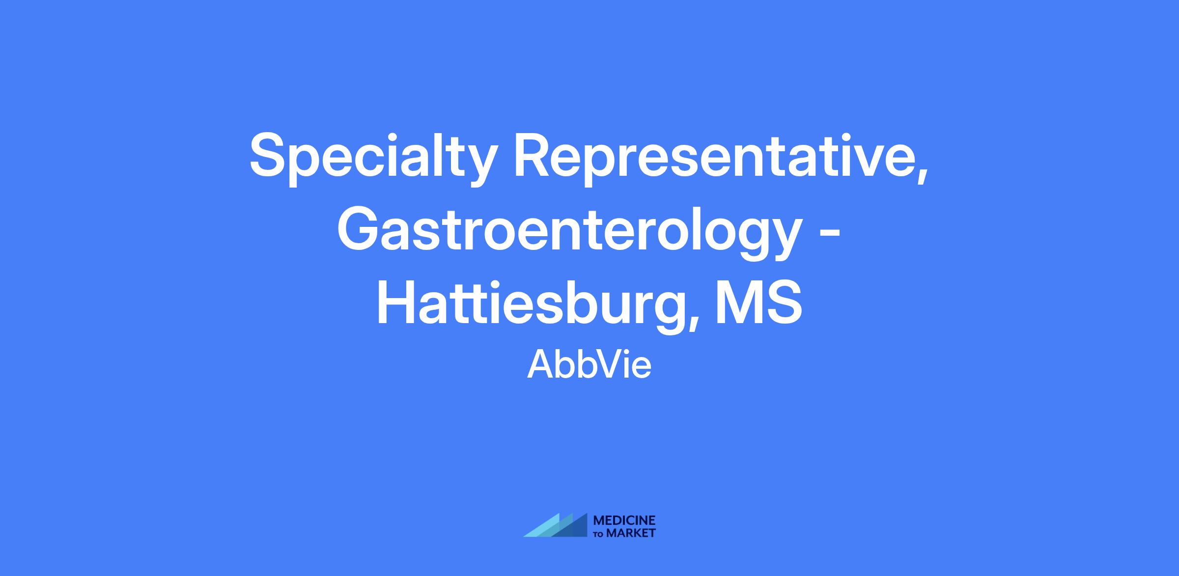 Specialty Representative, Gastroenterology in Hattiesburg, MS. This field-based role covers Jackson, Hattiesburg, Laurel and Mobile AL and surrounding areas. The role executes brand strategy and tactics in the field, manages territory and targets accounts, builds strong customer relationships, and centers patient needs while operating within AbbVie’s code of conduct and all applicable laws and regulations.