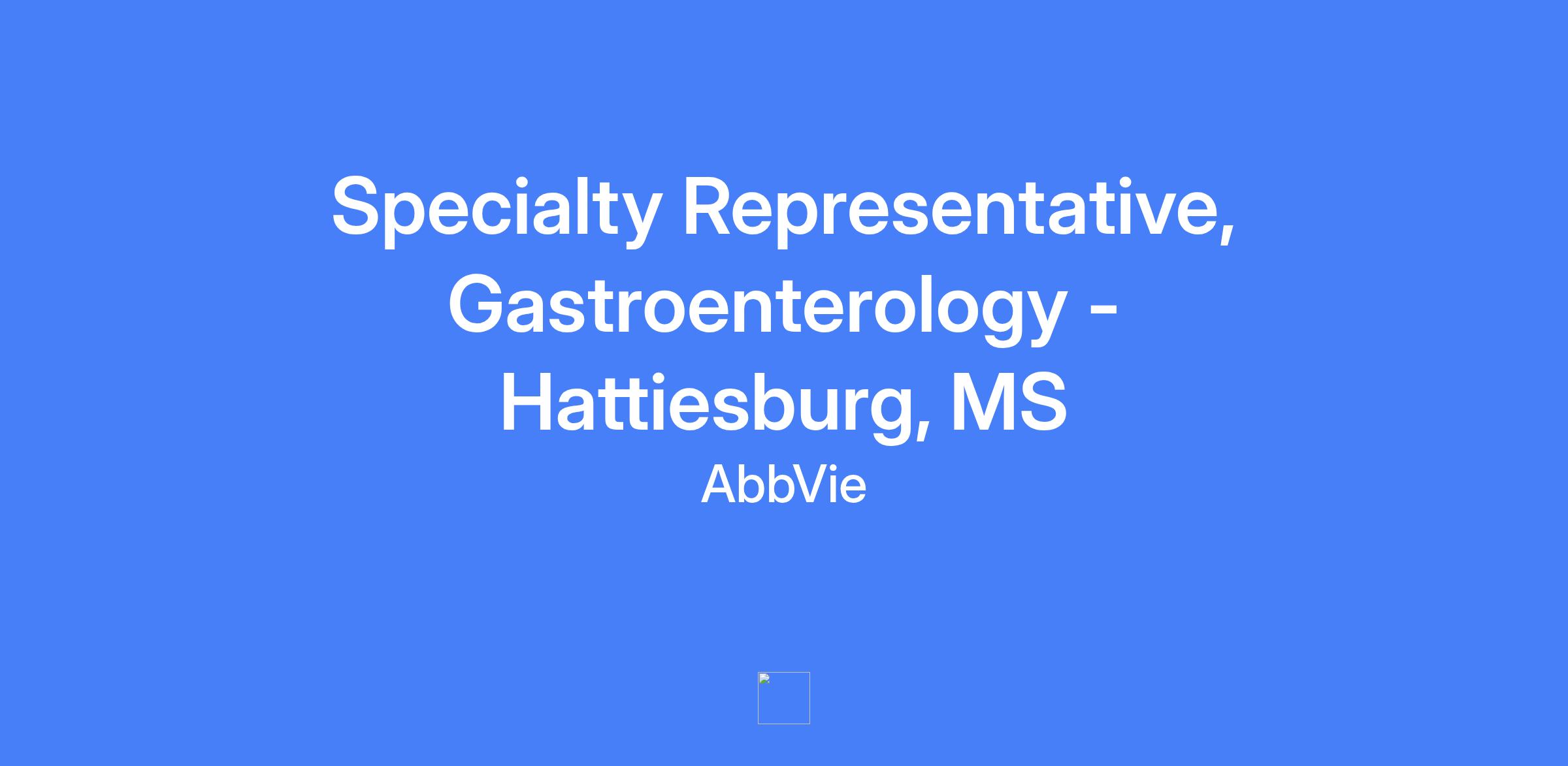Specialty Representative, Gastroenterology in Hattiesburg, MS. This field-based role covers Jackson, Hattiesburg, Laurel and Mobile AL and surrounding areas. The role executes brand strategy and tactics in the field, manages territory and targets accounts, builds strong customer relationships, and centers patient needs while operating within AbbVie’s code of conduct and all applicable laws and regulations.