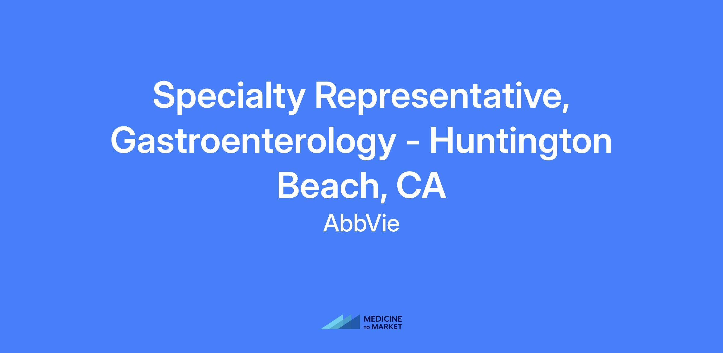 Specialty Representative, Gastroenterology - Huntington Beach, CA. Field-based role covering Huntington Beach, Newport Beach, Riverside, Irvine, Anaheim, San Clemente, Fullerton and surrounding areas. Responsible for executing brand strategy and tactics in the field, managing the assigned territory and targeted accounts, building strong customer relationships, and solving customer needs to maximize short and long-term sales performance, while adhering to AbbVie’s code of conduct and all applicable laws and regulations.