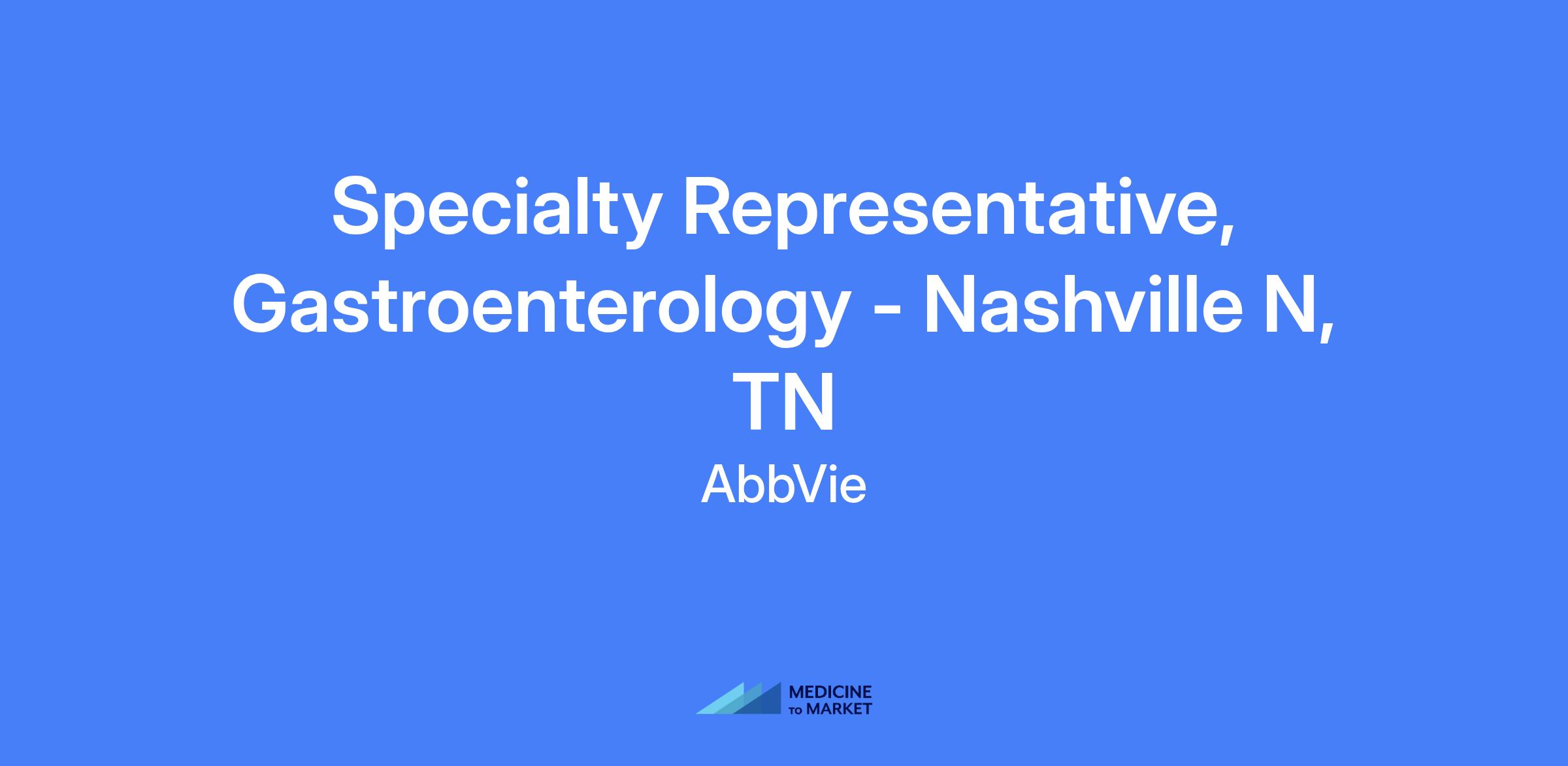 Specialty Representative, Gastroenterology - Nashville N, TN. Execute brand strategy and tactics in field, drive sales performance, effectively manage assigned territory and targeted accounts, build strong customer relationships and customer needs solving capability to maximize short and long term sales performance while placing the patient at the center and operating within AbbVie’s code of conduct and all applicable laws and regulations.