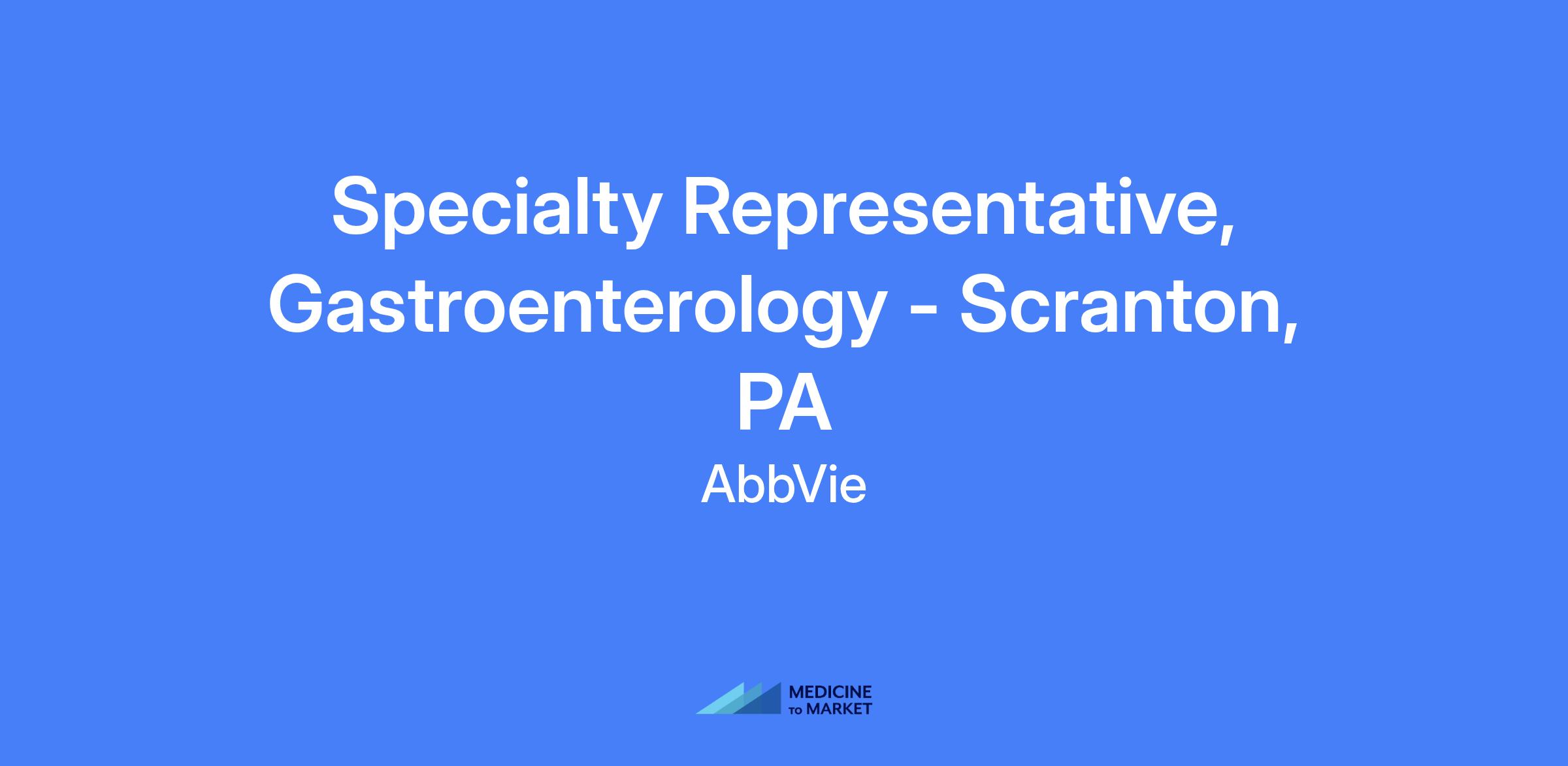 Specialty Representative, Gastroenterology in Scranton, PA. Execute brand strategy and tactics in the field, manage the assigned territory and targeted accounts, build strong customer relationships, and solve customer needs to maximize short and long-term sales performance while operating within AbbVie’s code of conduct and applicable laws and regulations.