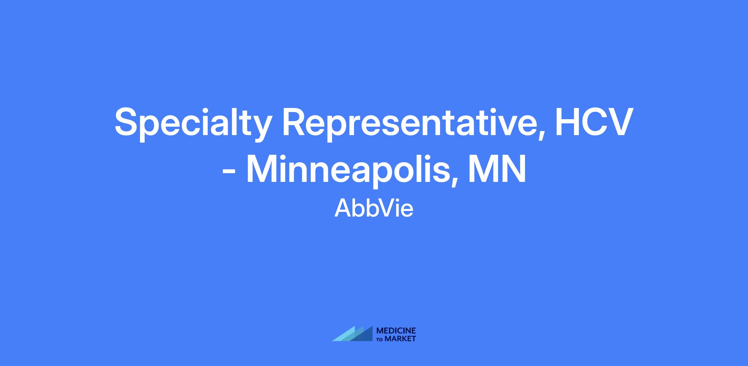 Specialty Representative, HCV - Minneapolis, MN. Execute brand strategy and tactics in field, drive sales performance, effectively manage assigned territory and targeted accounts, and build strong customer relationships to maximize short and long term sales performance with patient-centered focus.