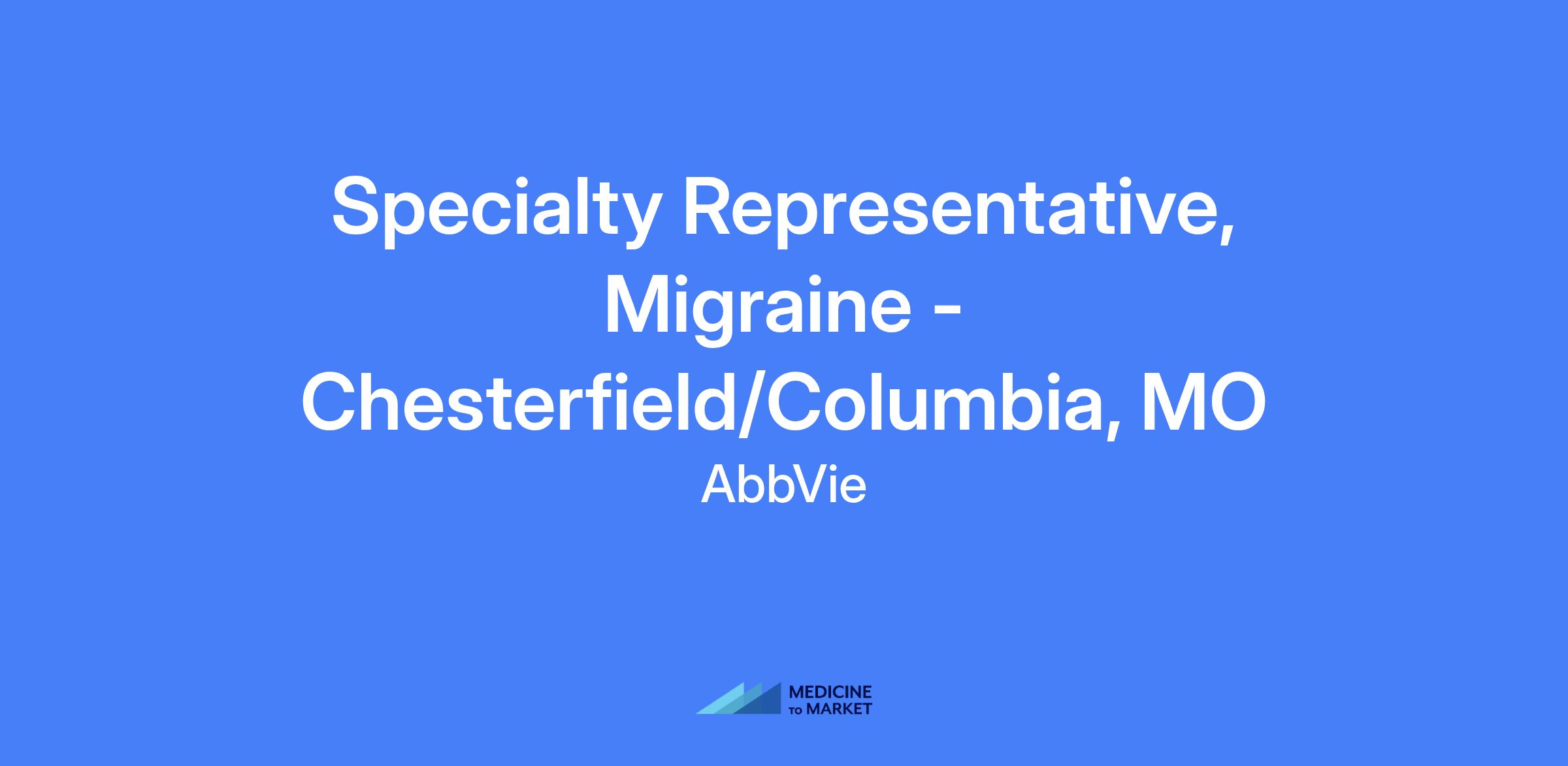 Specialty Representative, Migraine - Chesterfield/Columbia, MO. Field-based role focused on executing brand strategy and tactics to drive sales performance, manage territory and accounts, and build strong customer relationships with patient-centric focus. Role requires working within AbbVie’s code of conduct and applicable laws.