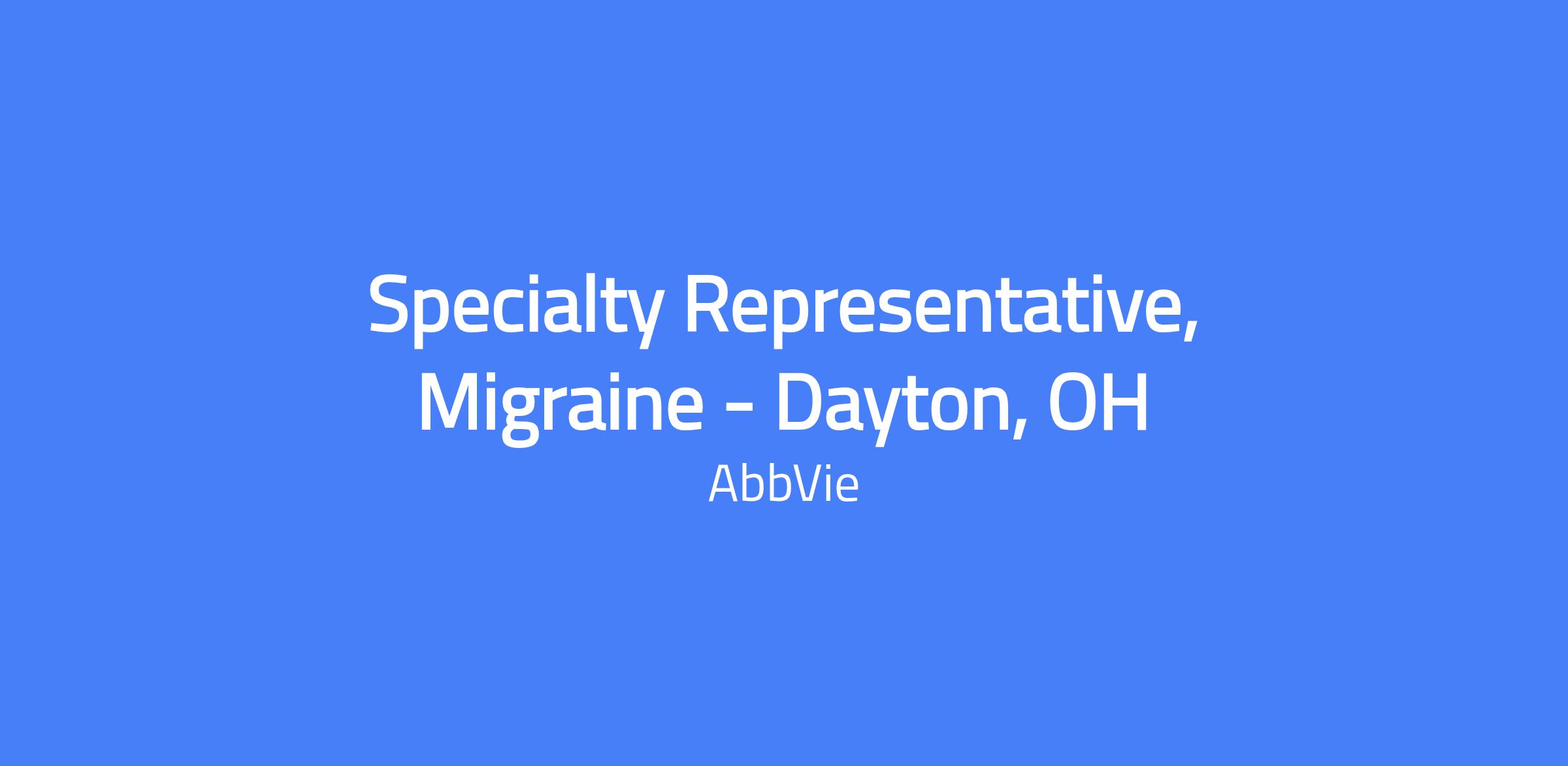 Field-based Specialty Representative focused on migraine, Dayton, OH. Responsible for delivering sales performance, building trusted customer relationships, executing call plans, and differentiating AbbVie’s value proposition with health care providers in assigned territory. Role requires meeting credentialing requirements to gain access to facilities and organizations in the territory.