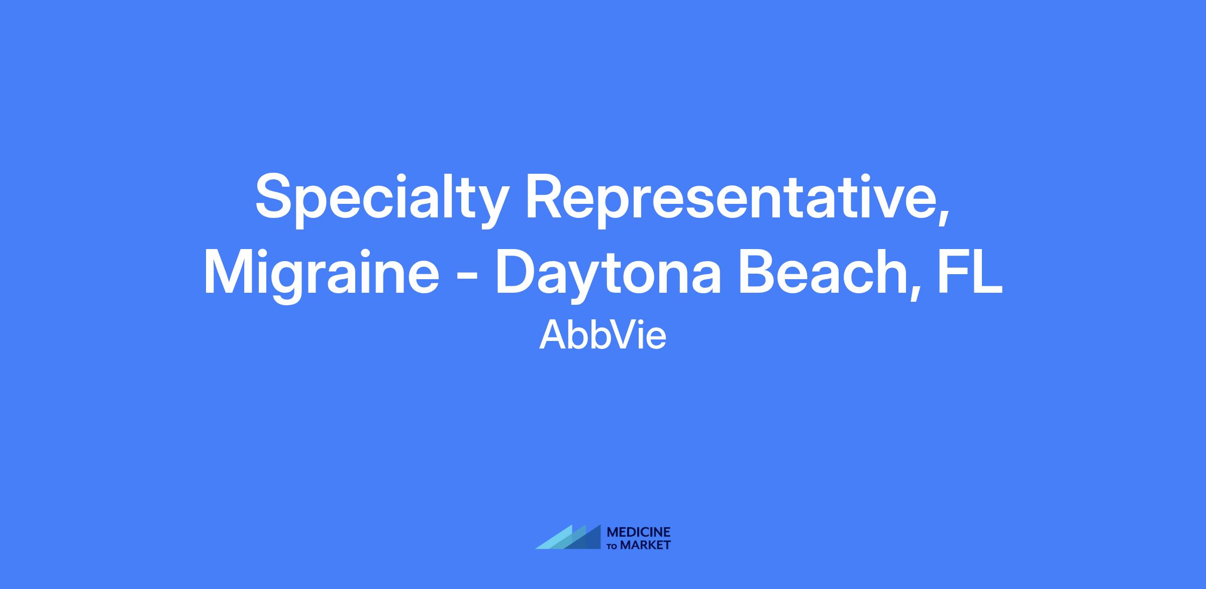 Specialty Representative, Migraine - Daytona Beach, FL. Field-based role; candidates should live within a reasonable distance from the primary city. Level hired will be commensurate with experience.