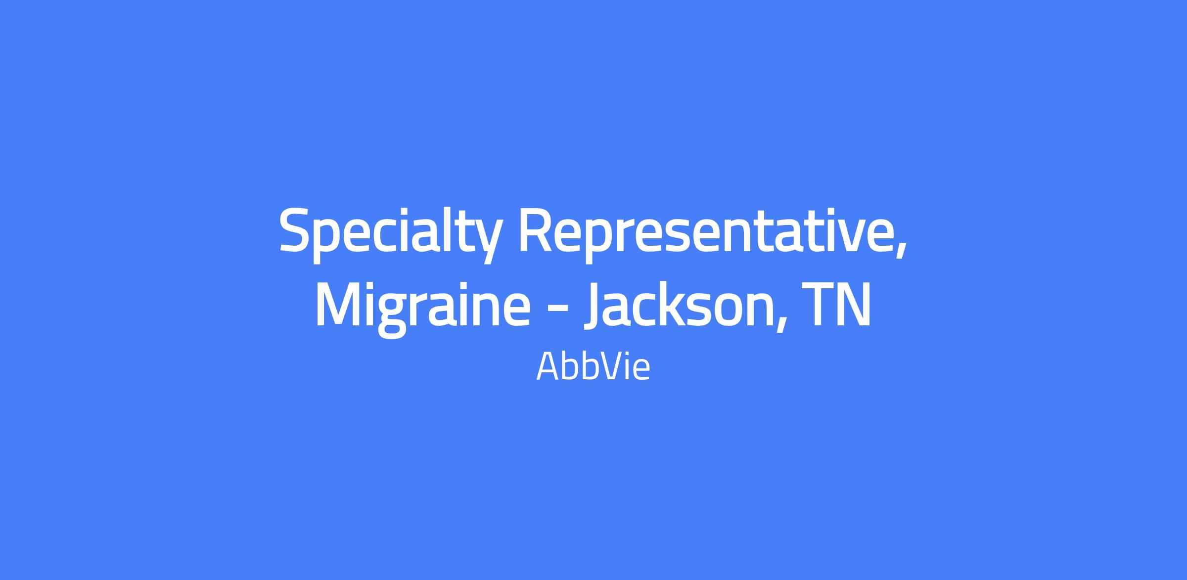 Field-based Specialty Representative for Migraine in Jackson, TN. This role executes brand strategy and field tactics, drives sales performance, and manages the assigned territory and targeted accounts. You will build strong customer relationships and apply customer needs solving to maximize short- and long-term sales, placing the patient at the center of AbbVie’s efforts and operating within the company's code of conduct and all applicable laws.