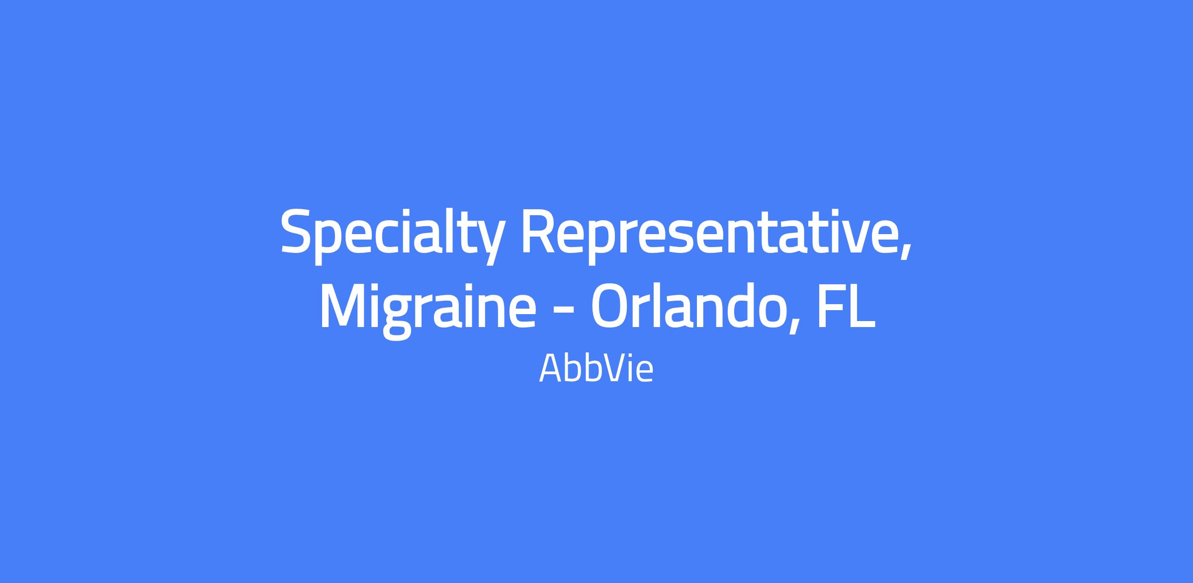 Specialty Representative, Migraine - Orlando, FL. This field-based role executes brand strategy and tactics in the field, drives sales performance, and manages the assigned territory and targeted accounts. The role focuses on building strong customer relationships, solving customer needs, and maximizing short- and long-term sales while operating within AbbVie’s code of conduct, policies, and applicable laws and regulations. The candidate should live within a reasonable distance from the primary city.