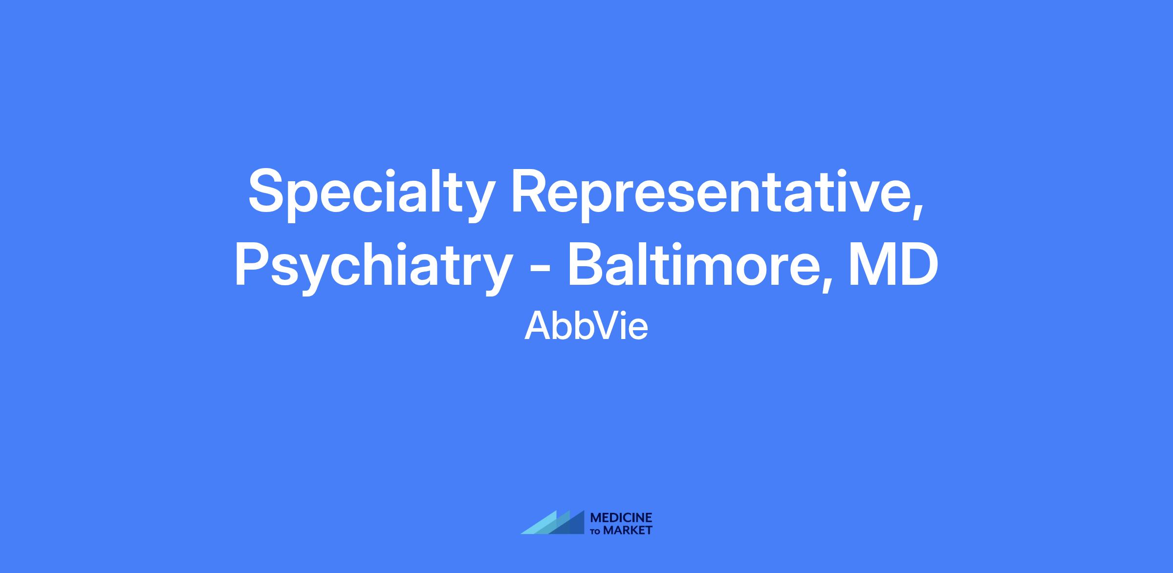 Specialty Representative, Psychiatry - Baltimore, MD. Field-based role responsible for executing brand strategy and tactics in the assigned territory, managing accounts, building customer relationships, and solving customer needs to maximize short and long-term sales performance with patient-centered focus.