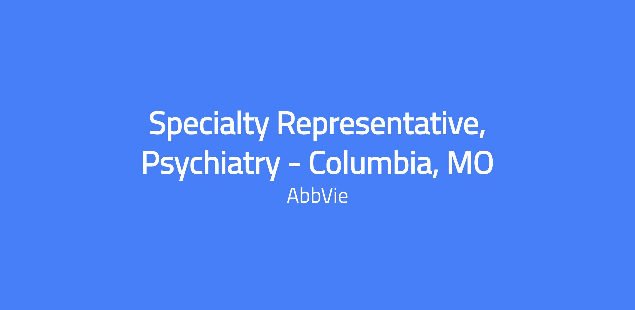 Specialty Representative, Psychiatry — Columbia, MO. Field-based role focused on promoting AbbVie products in the psychiatry therapeutic area, achieving sales targets, and building trusted relationships with health care providers. Requires territory management, credentialing compliance, and the ability to operate within a matrix environment.