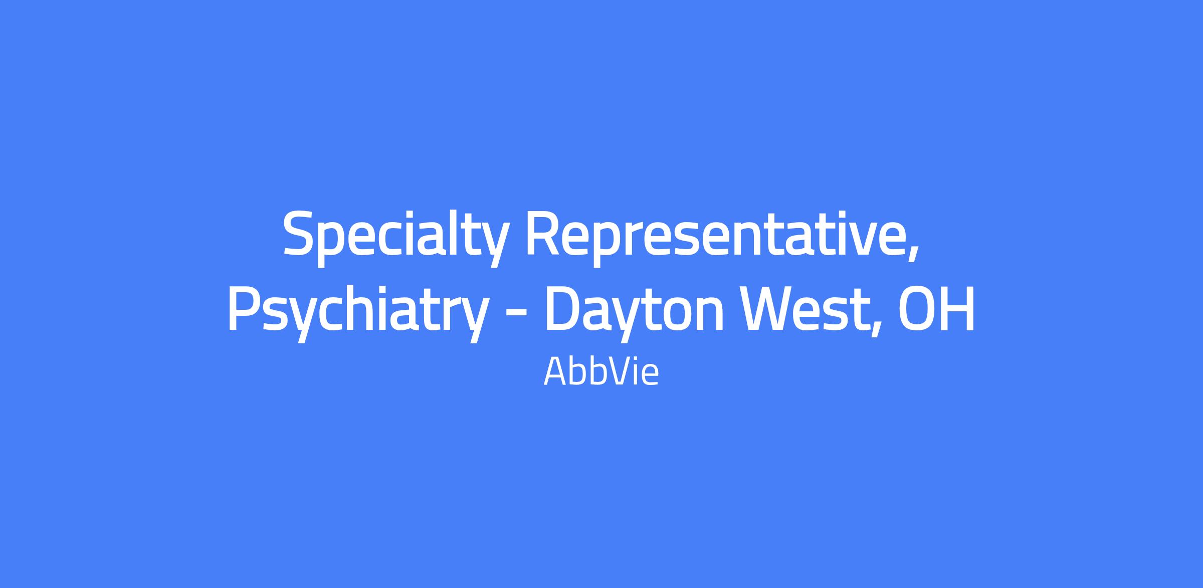 Field-based Specialty Representative, Psychiatry in Dayton West, OH. Responsible for executing brand strategy and tactics in the field, managing the assigned territory and targeted accounts, building strong customer relationships, and driving sales performance while maintaining compliance with AbbVie policies and applicable laws.