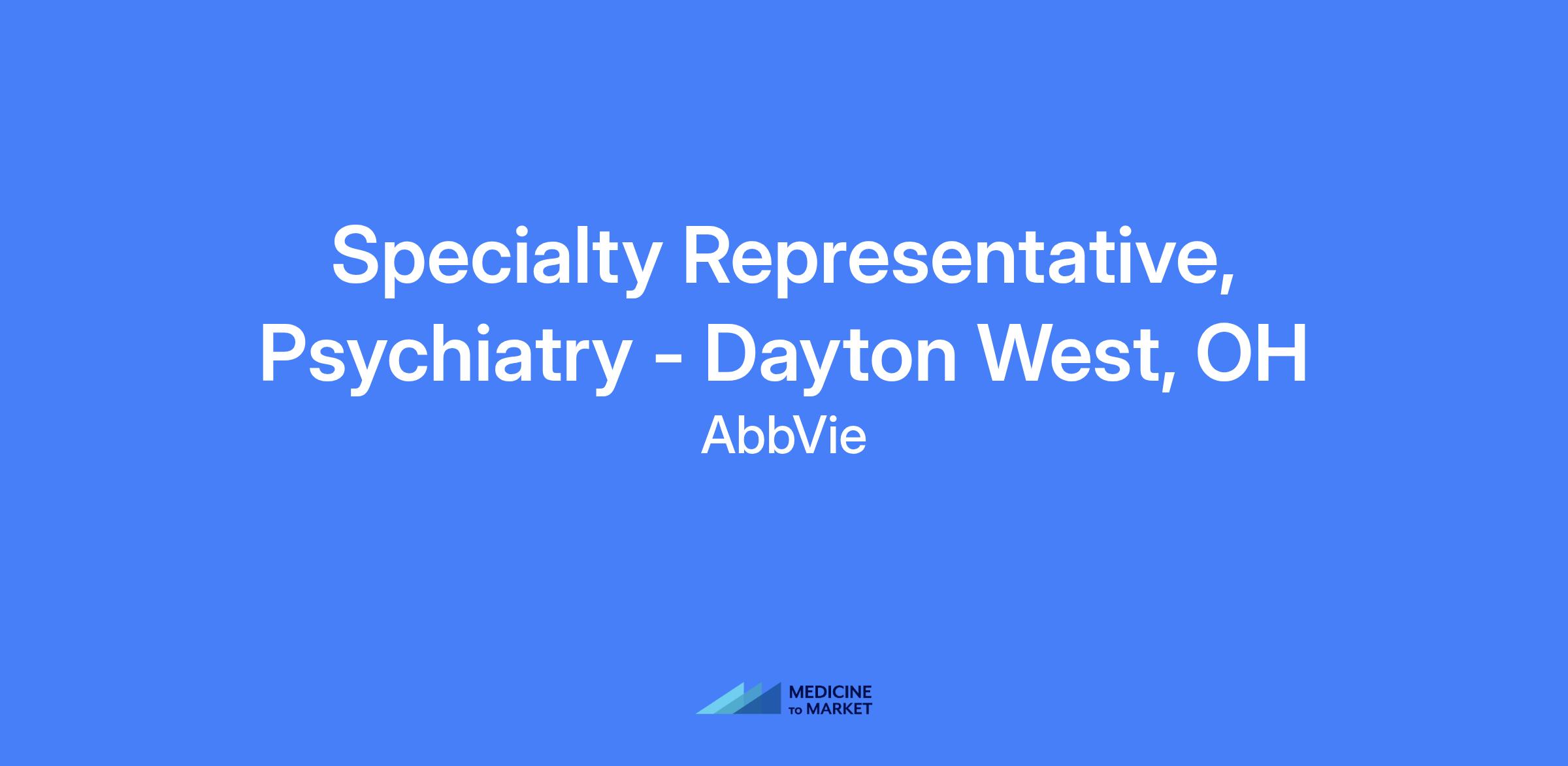 Specialty Representative, Psychiatry - Dayton West, OH. Field-based role; candidates should live within a reasonable distance from the primary city. Talent will be hired at a level commensurate with experience.