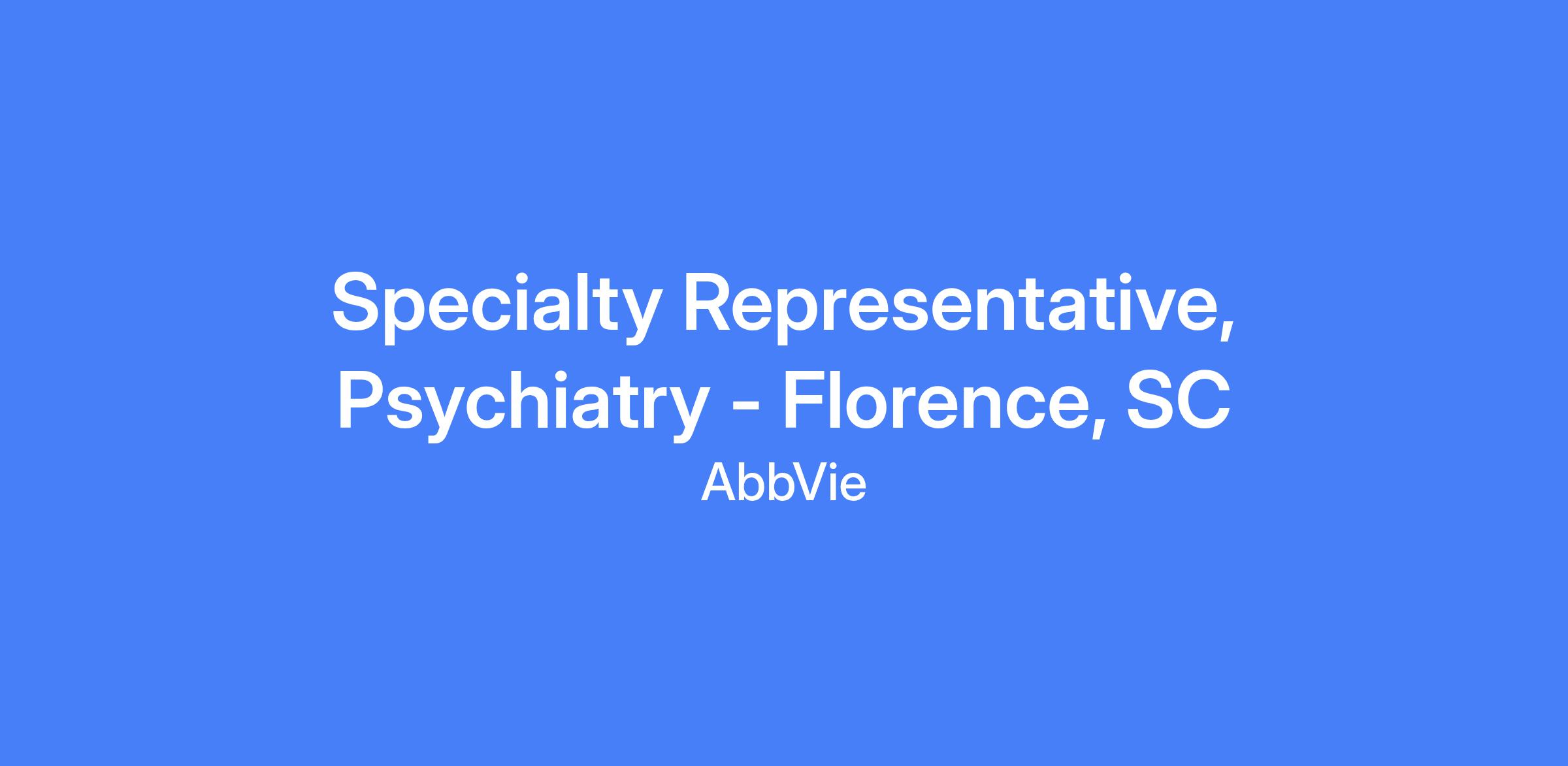 This field-based Specialty Representative position is for Psychiatry in Florence, SC. Talent will be hired at a level commensurate with experience and must live within a reasonable distance from the primary city. The role requires executing brand strategy and tactics in the field, driving sales performance, managing the assigned territory and targeted accounts, building strong customer relationships, and solving customer needs to maximize short and long-term sales while placing the patient at the center and operating within AbbVie’s code of conduct and applicable laws.