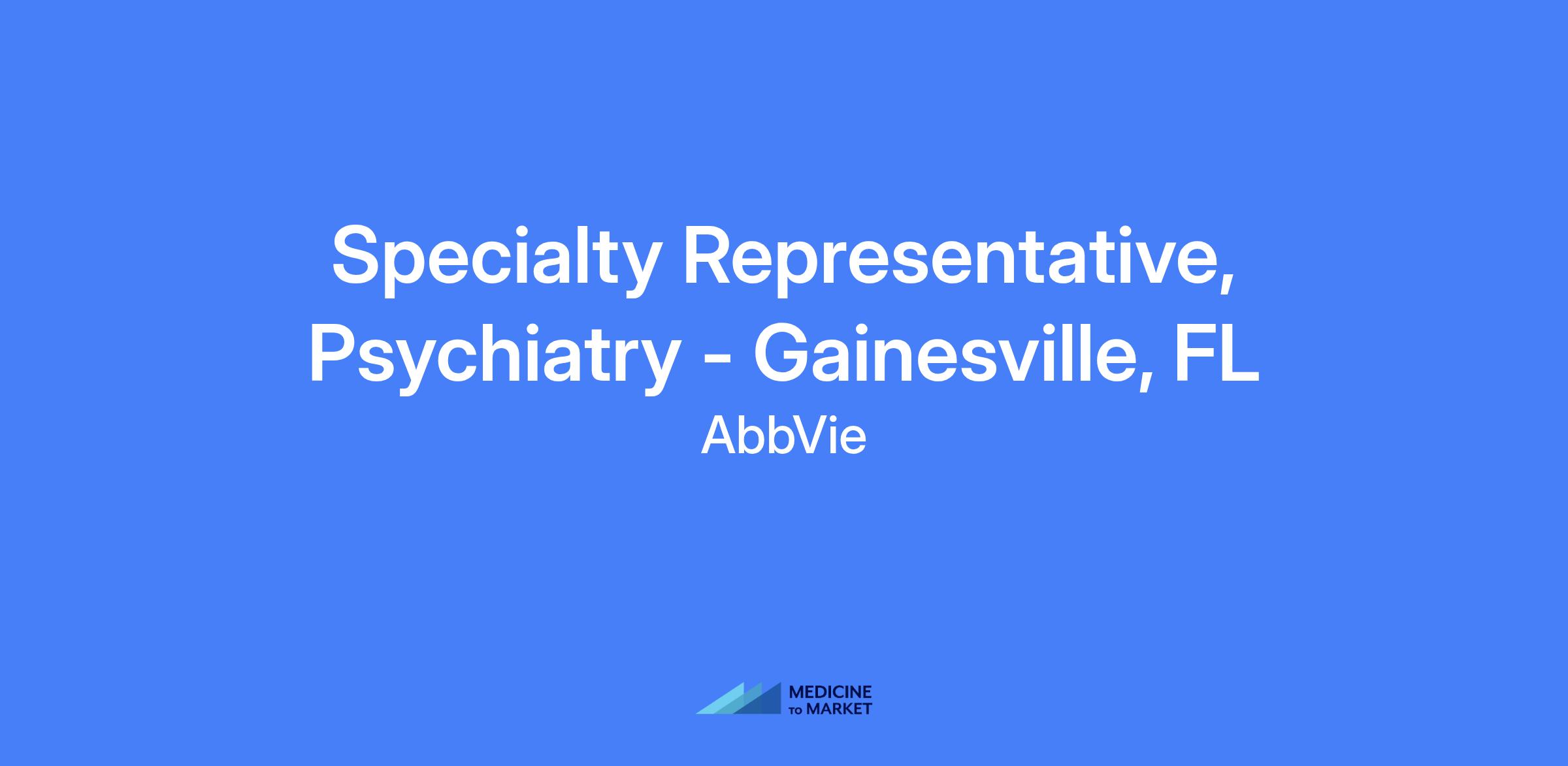Specialty Representative, Psychiatry - Gainesville, FL. Field-based role responsible for executing brand strategy and tactics in the assigned territory to maximize short and long-term sales performance, placing the patient at the center of efforts while complying with all laws and AbbVie policies. Travel required within the territory.