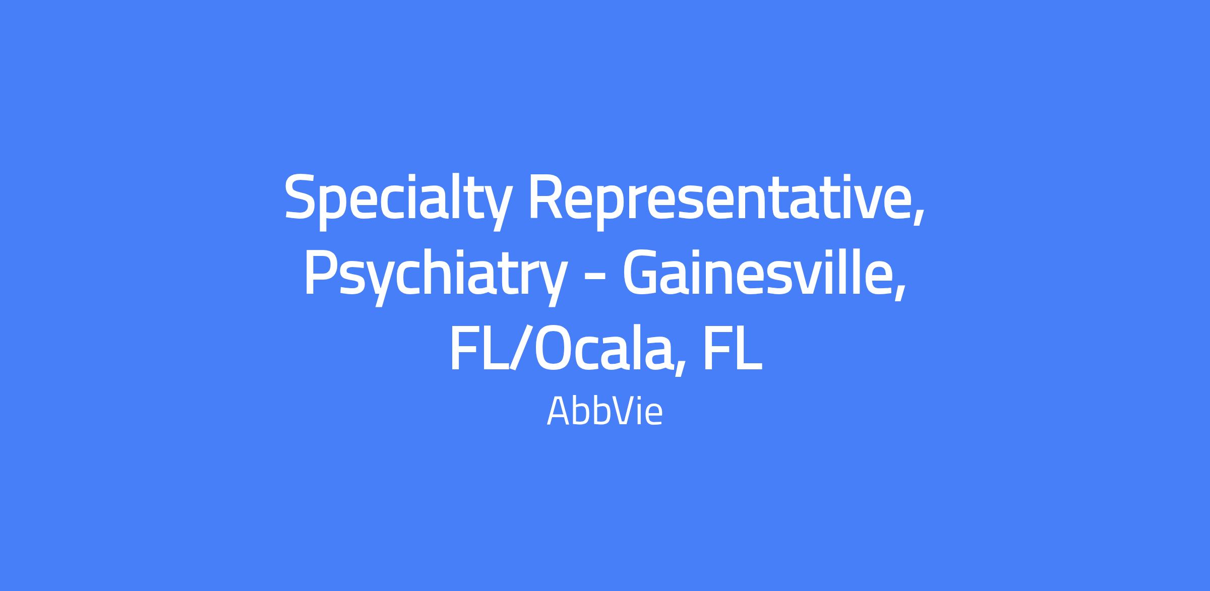 Field-based Psychiatry Specialty Representative serving Gainesville, FL and Ocala, FL. Execute brand strategy and tactics in the field, drive sales performance, and manage an assigned territory and targeted accounts. Build strong customer relationships and address customer needs to maximize short- and long-term sales while operating within AbbVie’s code of conduct and all applicable laws. Candidates must live within a reasonable distance from the primary city, and compensation will reflect experience.