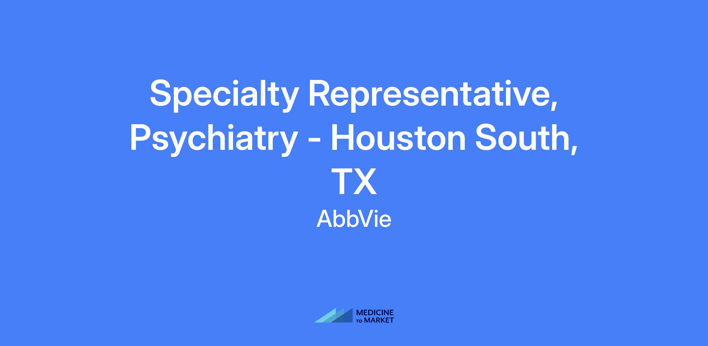 Specialty Representative, Psychiatry for Houston South, TX. This field-based role requires living within a reasonable distance from the primary city and will be hired at a level commensurate with experience. The incumbent is responsible for delivering sales performance, meeting brand KPIs, and building trusted customer relationships with healthcare providers in the assigned territory.