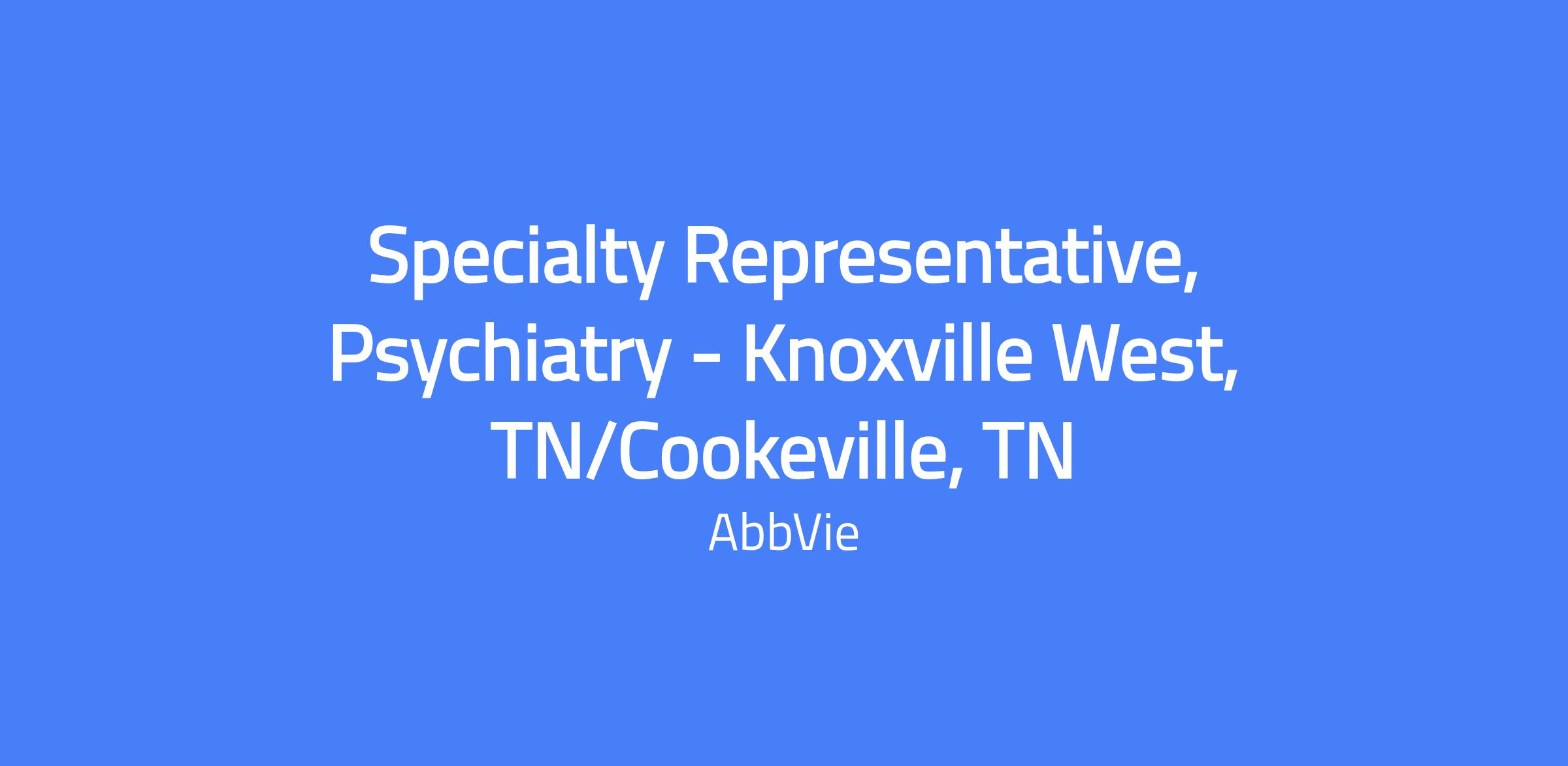 Specialty Representative, Psychiatry – Knoxville West, TN / Cookeville, TN. Field-based role that delivers brand strategy and sales performance within a designated territory, builds strong customer relationships, and focuses on patient-centered outcomes within AbbVie’s codes of conduct and applicable laws.