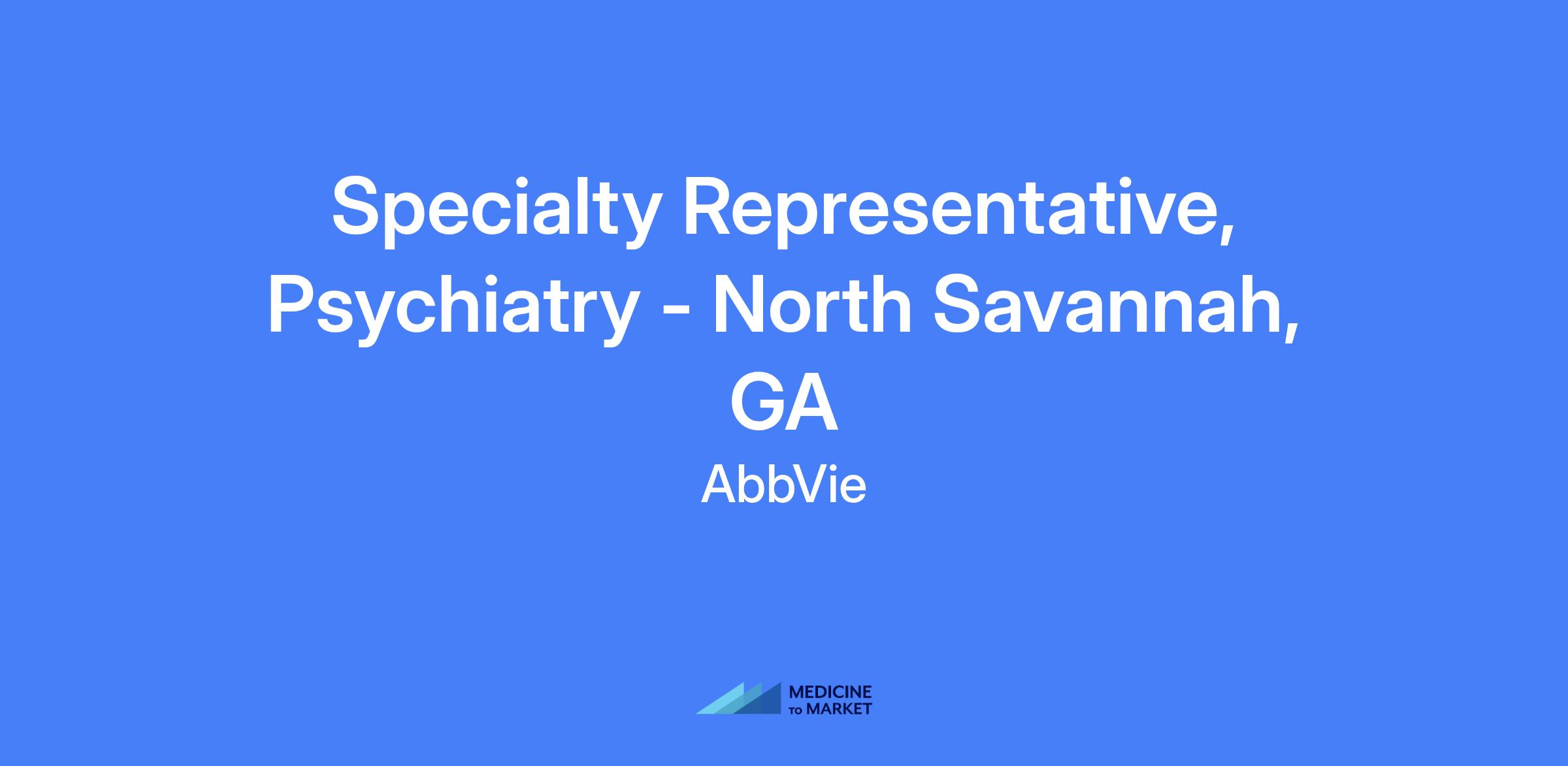 Specialty Representative, Psychiatry - North Savannah, GA. Field-based role focused on executing brand strategy and tactics in the assigned territory to maximize short and long-term sales performance, placing the patient at the center of efforts and operating within AbbVie’s policies and applicable laws.