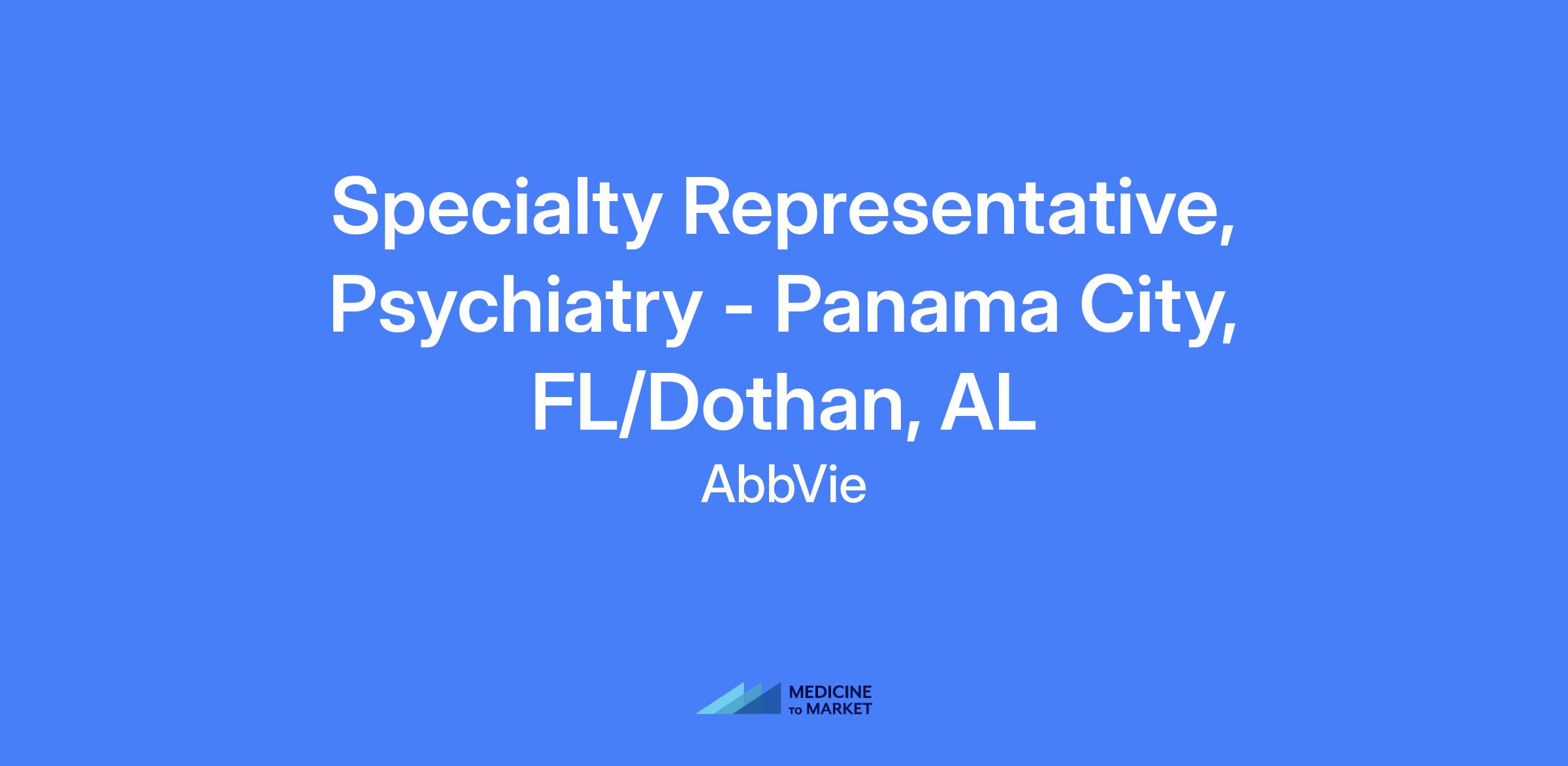 Specialty Representative, Psychiatry covers Panama City, FL and Dothan, AL. This field-based role requires you to live within a reasonable distance from the primary city and be hired at a level commensurate with experience. You will execute brand strategy and tactics in the field, manage the assigned territory and targeted accounts, and build strong customer relationships with a patient-centered approach while complying with all applicable laws and AbbVie policies.