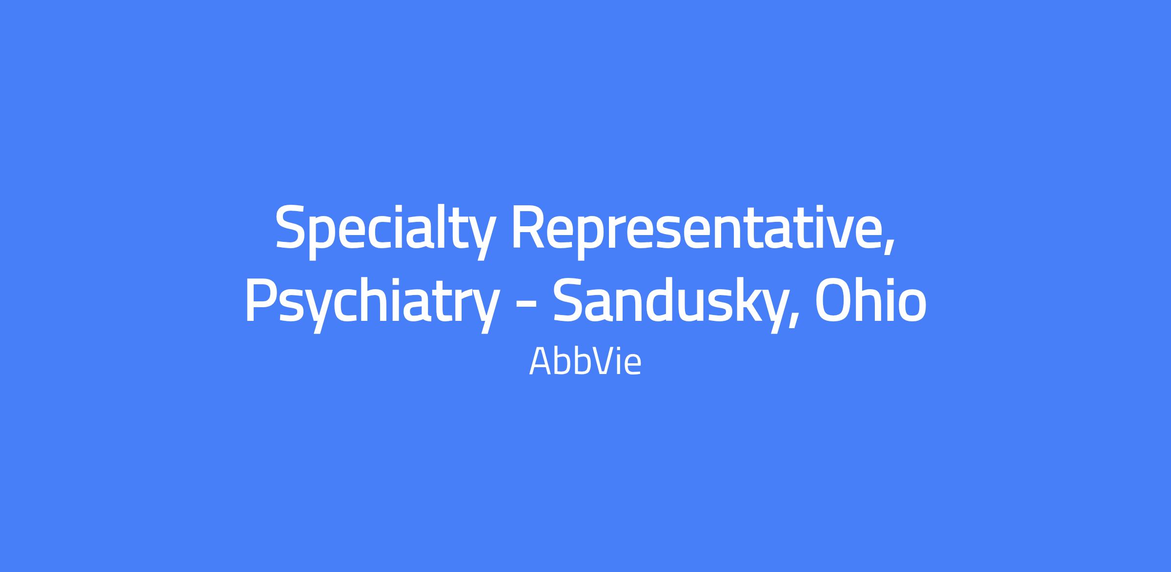 Specialty Representative, Psychiatry - Sandusky, Ohio. This field-based role executes brand strategy and tactics in the field, manages the assigned territory and targeted accounts, builds strong customer relationships and a customer needs solving capability to maximize short and long term sales performance while placing the patient at the center of AbbVie’s efforts and operating within applicable laws and regulations. Talent will be hired at a level commensurate with experience.