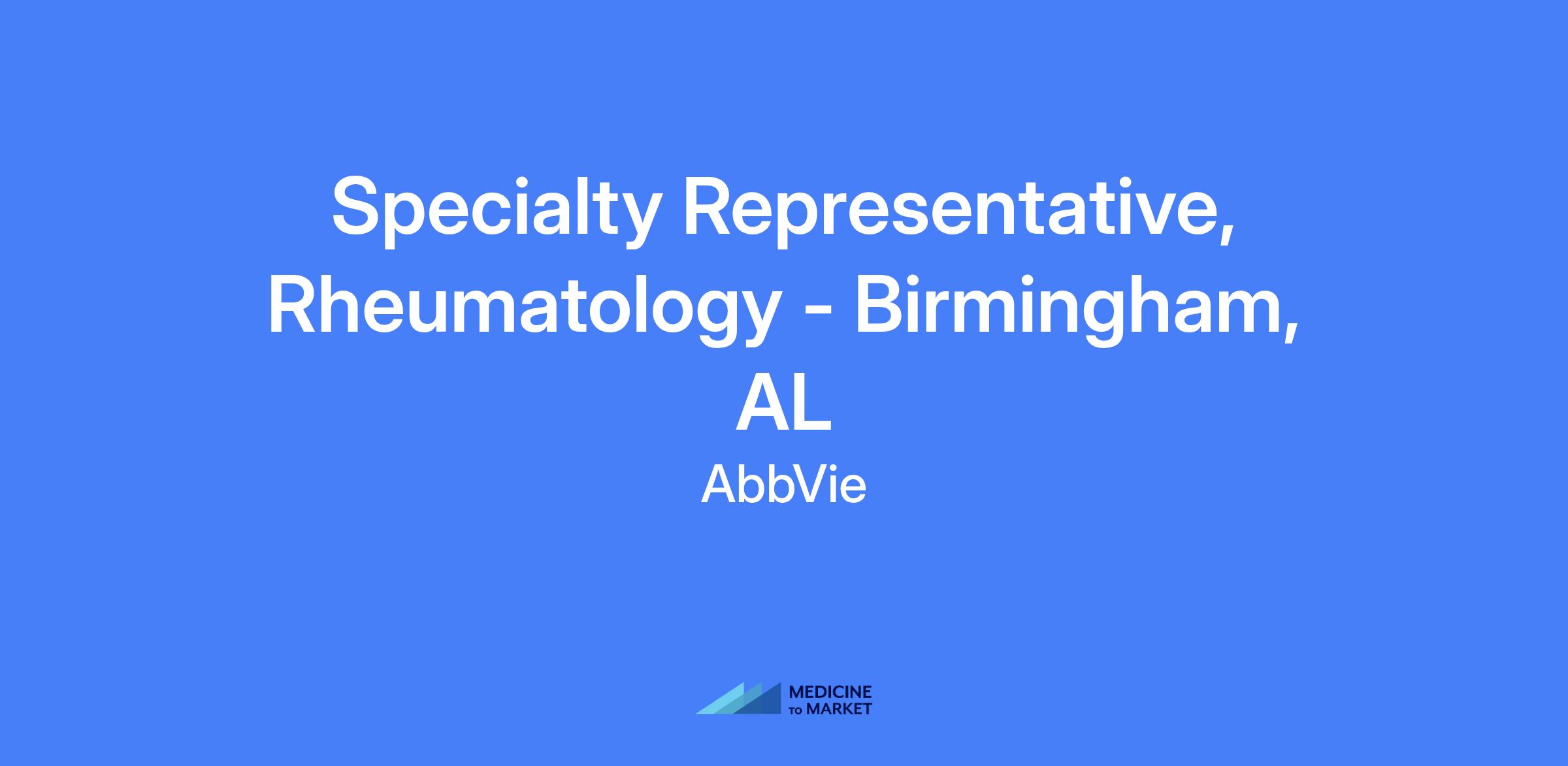 Specialty Representative, Rheumatology - Birmingham, AL. Field-based role serving the Alabaster to Florence geography, focused on executing brand strategy and driving sales performance while placing the patient at the center of AbbVie’s efforts.