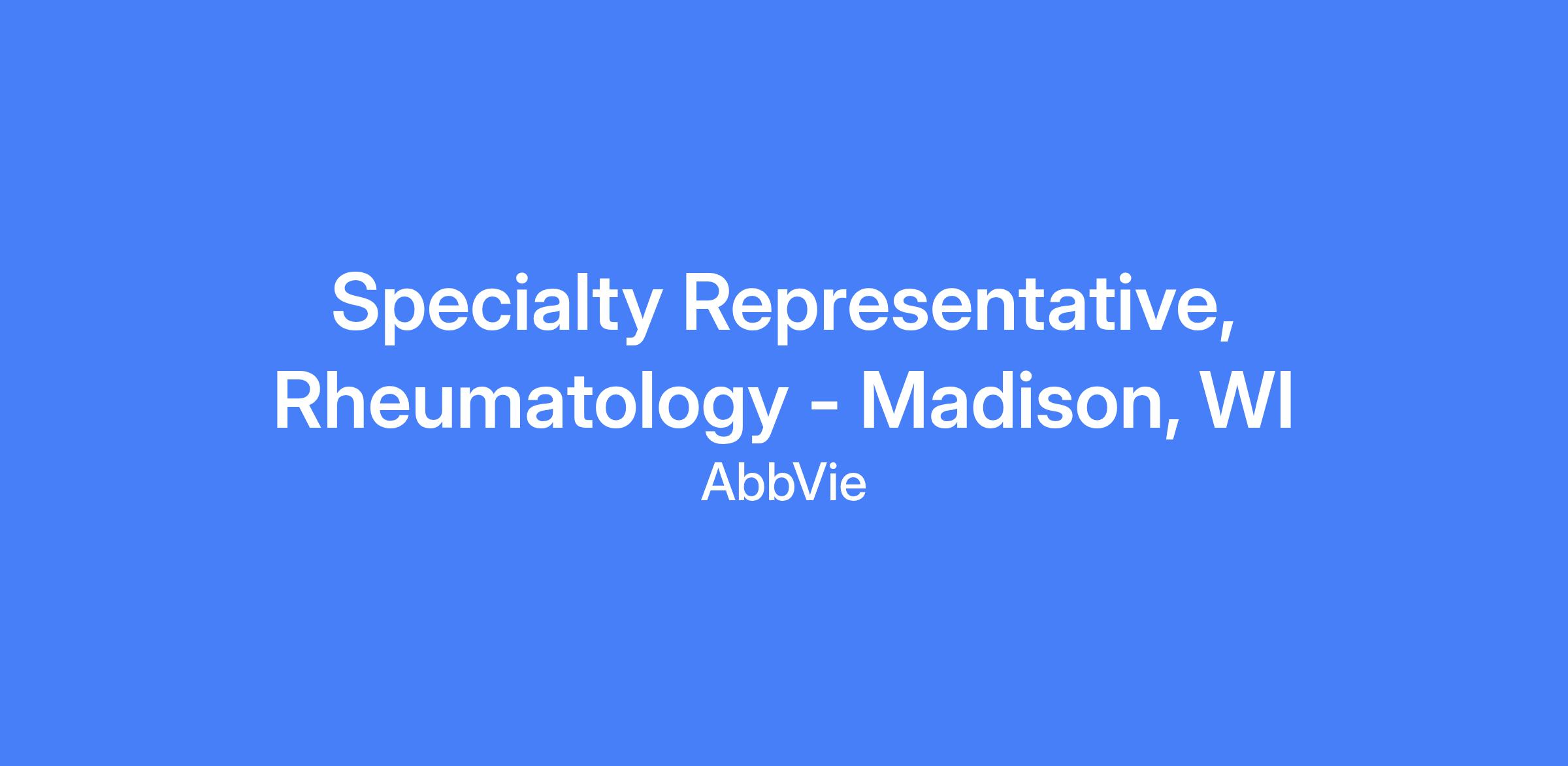 Specialty Representative, Rheumatology - Madison, WI. This field-based role executes brand strategy and tactics, drives sales performance, and effectively manages the assigned territory and targeted accounts. You will build strong customer relationships, solve customer needs, and place the patient at the center of AbbVie’s efforts while complying with all policies and regulations. The geography includes multiple cities and requires residence within a reasonable distance from the primary city.