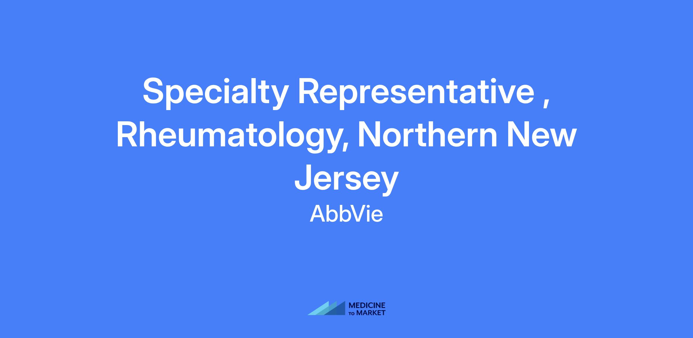 Specialty Representative, Rheumatology, Northern New Jersey. Execute brand strategy and tactics in field, drive sales performance, effectively manage assigned territory and targeted accounts, build strong customer relationships and a customer needs solving capability to maximize short and long term sales performance with patient at the center, adhering to AbbVie’s code of conduct, policies and all applicable laws and regulations.