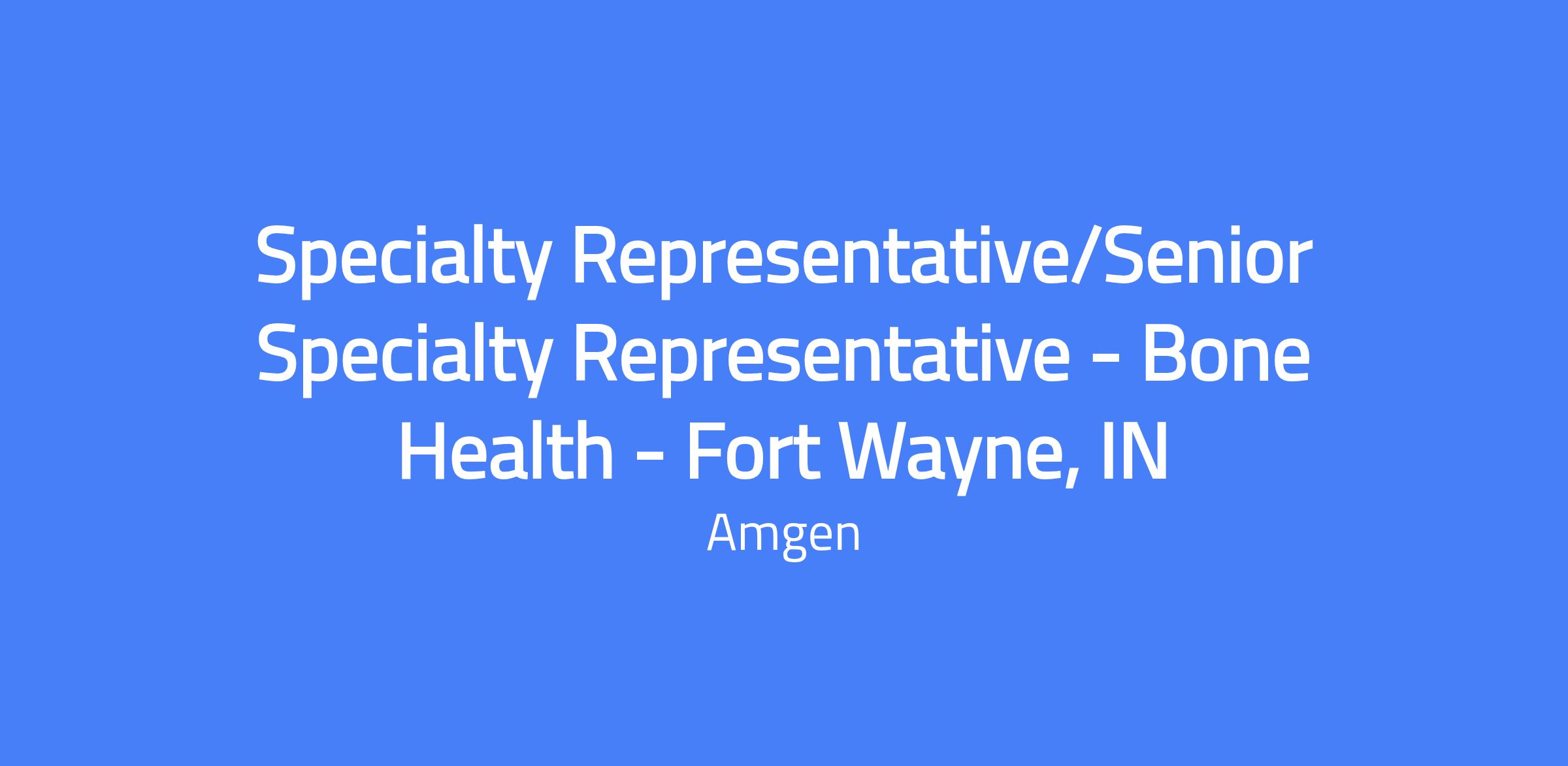 Specialty Representative/Senior Specialty Representative for Bone Health in Fort Wayne, IN; territory includes Fort Wayne, New Haven, Roanoke, and Leo-Cedarville. The role serves as the primary customer contact, delivering clinical knowledge of Amgen products to medical professionals and helping them navigate payer environments. You will implement marketing strategy and promote Amgen medicines under the guidance of the District Manager within your assigned territory.
