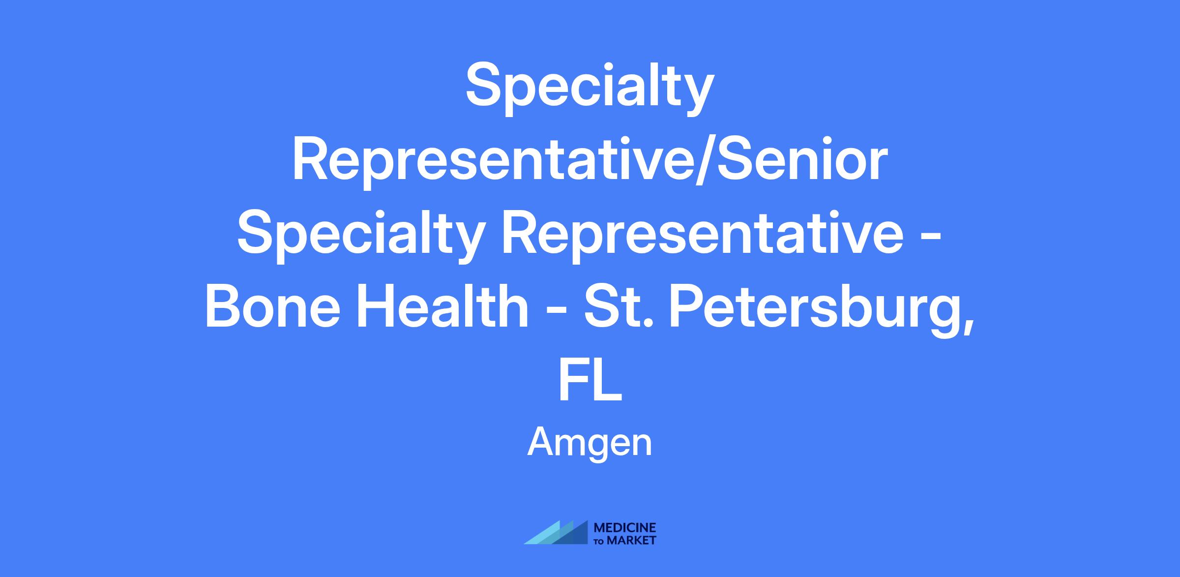 Specialty Representative/Senior Specialty Representative – Bone Health, based in St. Petersburg, FL. Territory covers Clearwater, Largo, Oldsmar, Pinellas Park, Safety Harbor, Seminole, and Tampa. This role serves as the primary customer contact, delivering clinical knowledge of Amgen products to medical professionals and helping them navigate the payer environment, while implementing marketing strategy as directed by the District Manager.