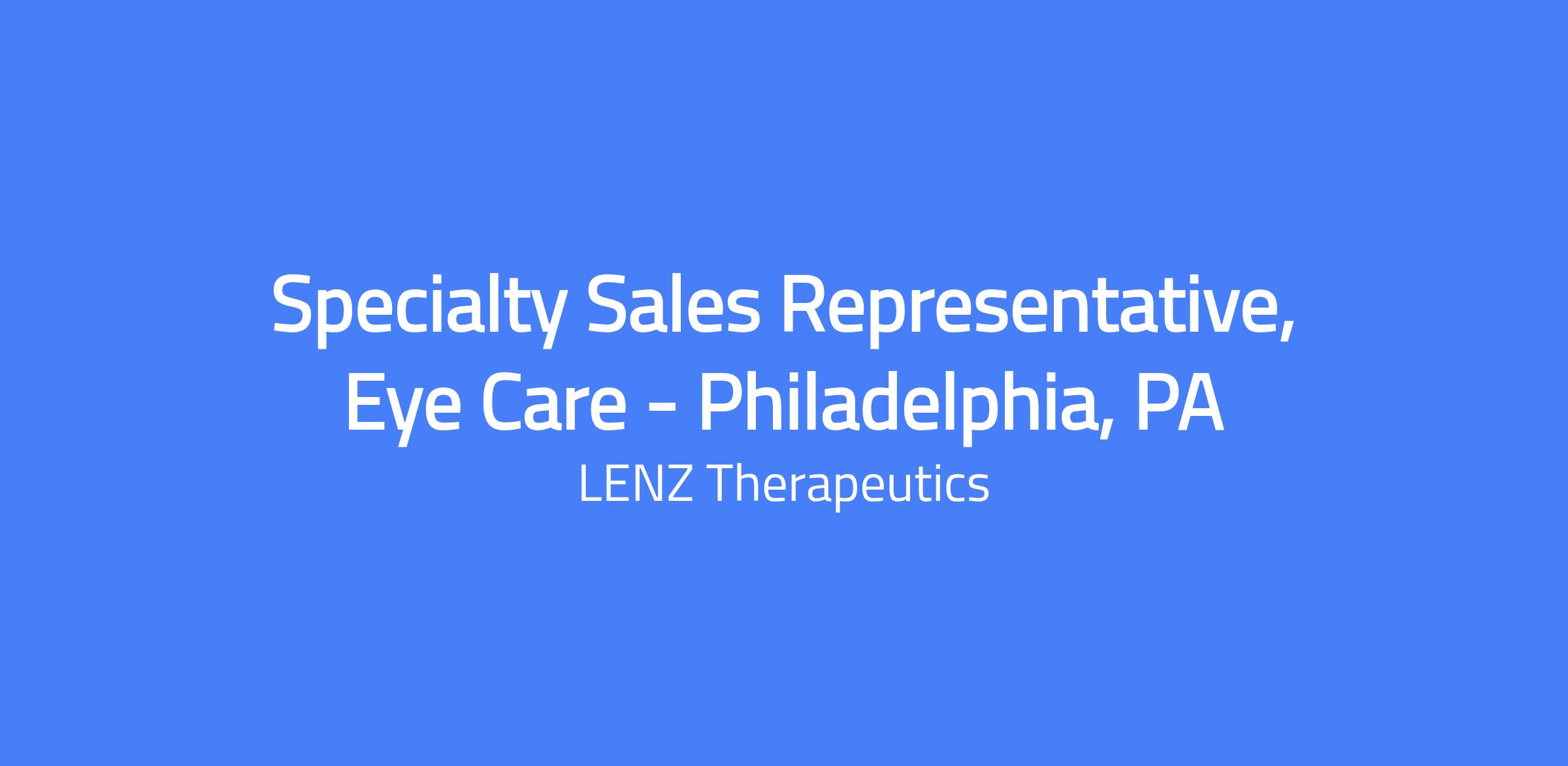 The Specialty Sales Representative, Eye Care, is a field-based role responsible for launching LENZ Therapeuticsโ ophthalmic presbyopia product portfolio in the Philadelphia, PA area. You will educate eye care providers, manage territory activities, and drive product adoption while upholding high standards of ethics and compliance. This role requires strategic thinking, tactical execution, and strong relationships with optometrists and ophthalmologists. Location: Remote, Philadelphia, PA; Travel: up to 40โ50% in some territories.