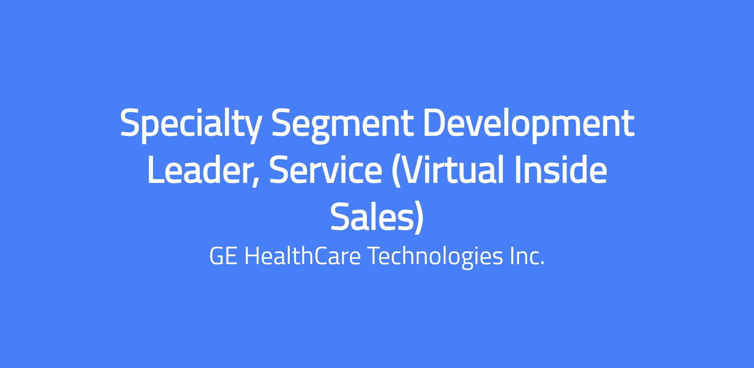 Job Description Summary The Specialty Segment Development Leader (SSDL â Virtual Inside Sales) is responsible for maintaining the relationship with Healthcare Provider departmental and technical decision makers in their assigned accounts and where applicable work in conjunction with Account Executives and Managers to gain access to additional Department Leadership and C-Suite decision makers. The Service Sales Representative is the clinical/technical and sales expert for his/her assigned products, solutions/services, and is expected to be able to differentiate GE's product/solution/service offerings, convey compelling value propositions, lead the opportunity, qualify the customer needs, develop, and present solutions proposals and quotations, and respond to customers' clinical/technical/process questions in order to successfully close clinical/technical/solution sales. This is a primarily remote role that requires the candidate to work from their home office while also traveling about 10-15% of the time (Territory: Philadelphia) GE HealthCare is a leading global medical technology and digital solutions innovator. Our purpose is to create a world where healthcare has no limits. Unlock your ambition, turn ideas into world-changing realities, and join an organization where every voice makes a difference, and every difference builds a healthier world. Job Description Responsibilities: Accountable for Annual achievement of multiple sales and revenue OP targets for assigned Specialty Segment territory driven through development of new growth and flow business Development of any new growth levers within assigned service segment to meet or exceed growth and capture requirements of the business Develop deal pricing strategy and ensure pricing compliance for segment opportunities Ownership and activation of option & upgrades, Refresh, and other strategic growth opportunities for service segment Forecast orders and sales within the applicable sales funnel tools and reports for their products/solutions/services/options and upgrades in their assigned territory/accounts. Territory & Account Management Manage install base and drive lifecycle management strategies Cultivating, leveraging, and developing long-term customer relationships with department decision makers, but including "C" level and Senior VP level relationships, coupled with the ability to identify and capitalize on opportunities that immediately satisfy customer needs Track and communicate market trends to/from the field including competitor data and develop and lead effective counterstrategies Be able to present and discuss the technology and clinical benefits in terms which are relevant to customers Differentiate assigned product offering during the various stages of the sales process, effectively using GE resources and approved product marketing and product promotion material to actively support the customer through their decision-making process Maintain up to date detailed knowledge of customer products and services. Create territory/account plans including opportunity development, competitive strategies and targets Build strong business relationships and formulate account relationship plans within the assigned accounts/ territory. Identify & respond to key account technical and departmental decision makers' needs and maintain customer contact records in the relevant CRM tools Represent the company at relevant medical conferences and technical exhibitions to promote product/solution and company Drive tender/bid process including the needs qualification, vendor selection, quotation and closure of their product/solution/service opportunities to meet orders, sales and margin targets as well as to maximize customer satisfaction assigned territory Management and leadership to resolution of customer issues related to commercial service including but not limited to disputes, collections, entitlement verification Qualifications: Bachelorâs degree OR an associate degree with a minimum of 2 years selling experience OR a high school diploma with a minimum of 5 years selling experience Valid motor vehicle license Legal authorization to work in the U.S. is required. We will not sponsor individuals for employment visas, now or in the future, for this job opening. Must live within the territory (Philadelphia). Desired Characteristics: Previous experience in the Healthcare industry and/or commercial sales. East Coast-based preferred due to client portfolio Previous experience with CRM systems Proven track record of sales success Ability to be an individual contributor in a team environment Self-starter motivated to prospect & find new opportunities Strong verbal phone communication, effective benefit-oriented presentation skills and robust influencing skills with persistence to overcome objectives Ability to quickly follow up with attention to detail Ability to synthesize complex issues and communicate in simple messages Excellent negotiation & closing skills Ability to energize, develop and build rapport at all levels within an organization #LI-Hybrid #LI-TM2 We will not sponsor individuals for employment visas, now or in the future, for this job opening. For U.S. based positions only, the pay range for this position is $48,240.00-$72,360.00 Annual. It is not typical for an individual to be hired at or near the top of the pay range and compensation decisions are dependent on the facts and circumstances of each case. The specific compensation offered to a candidate may be influenced by a variety of factors including skills, qualifications, experience and location. In addition, this position may also be eligible to earn performance based incentive compensation, which may include cash bonus(es) and/or long term incentives (LTI). GE HealthCare offers a competitive benefits package, including not but limited to medical, dental, vision, paid time off, a 401(k) plan with employee and company contribution opportunities, life, disability, and accident insu