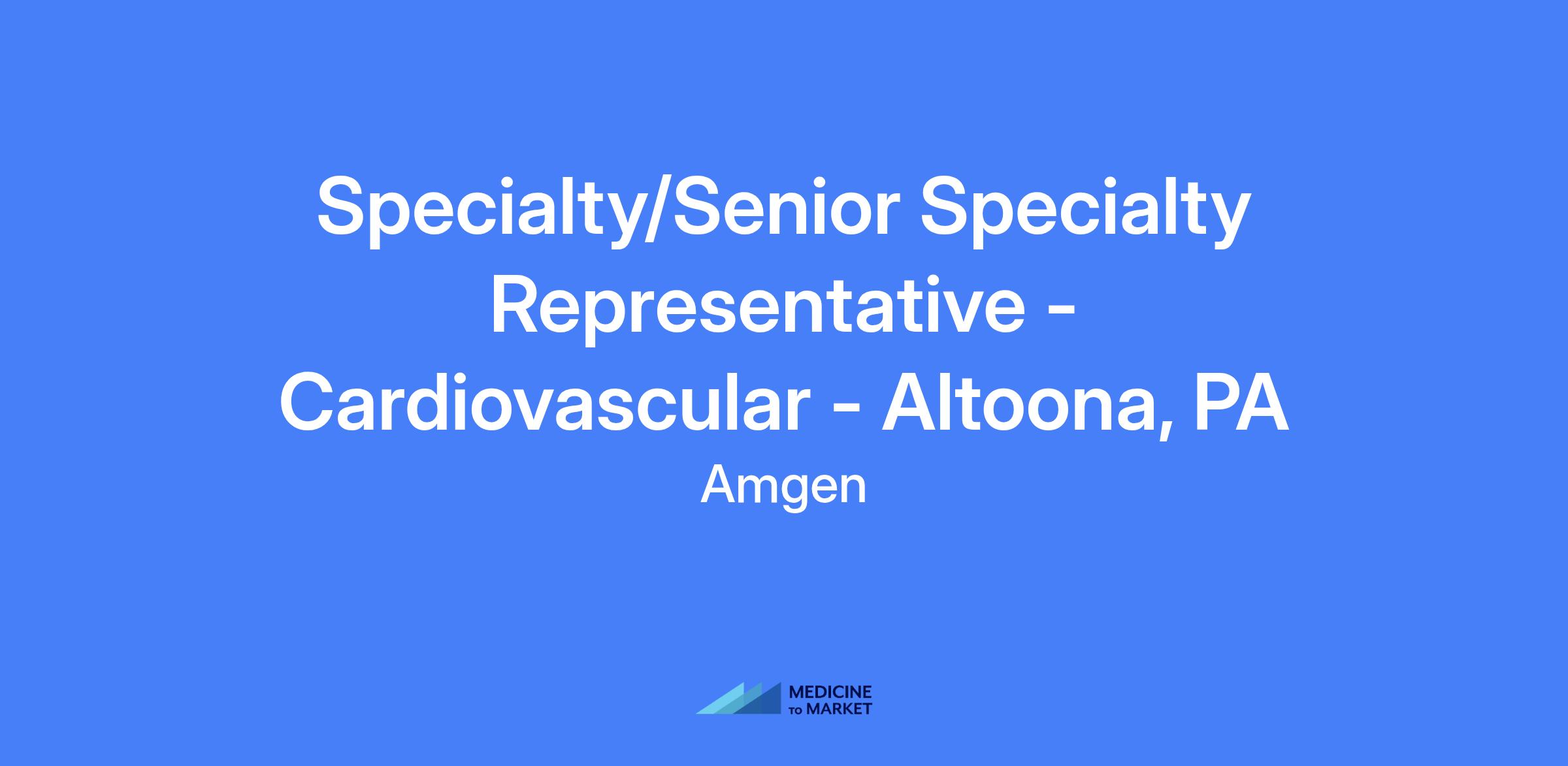 Specialty/Senior Specialty Representative for Cardiovascular based in Altoona, PA, covering territory including Johnstown, Altoona, Indiana, State College, Dubois, and surrounding areas. The role focuses on providing clinical knowledge of Amgen products to medical professionals and implementing marketing strategies as directed by the District Manager.