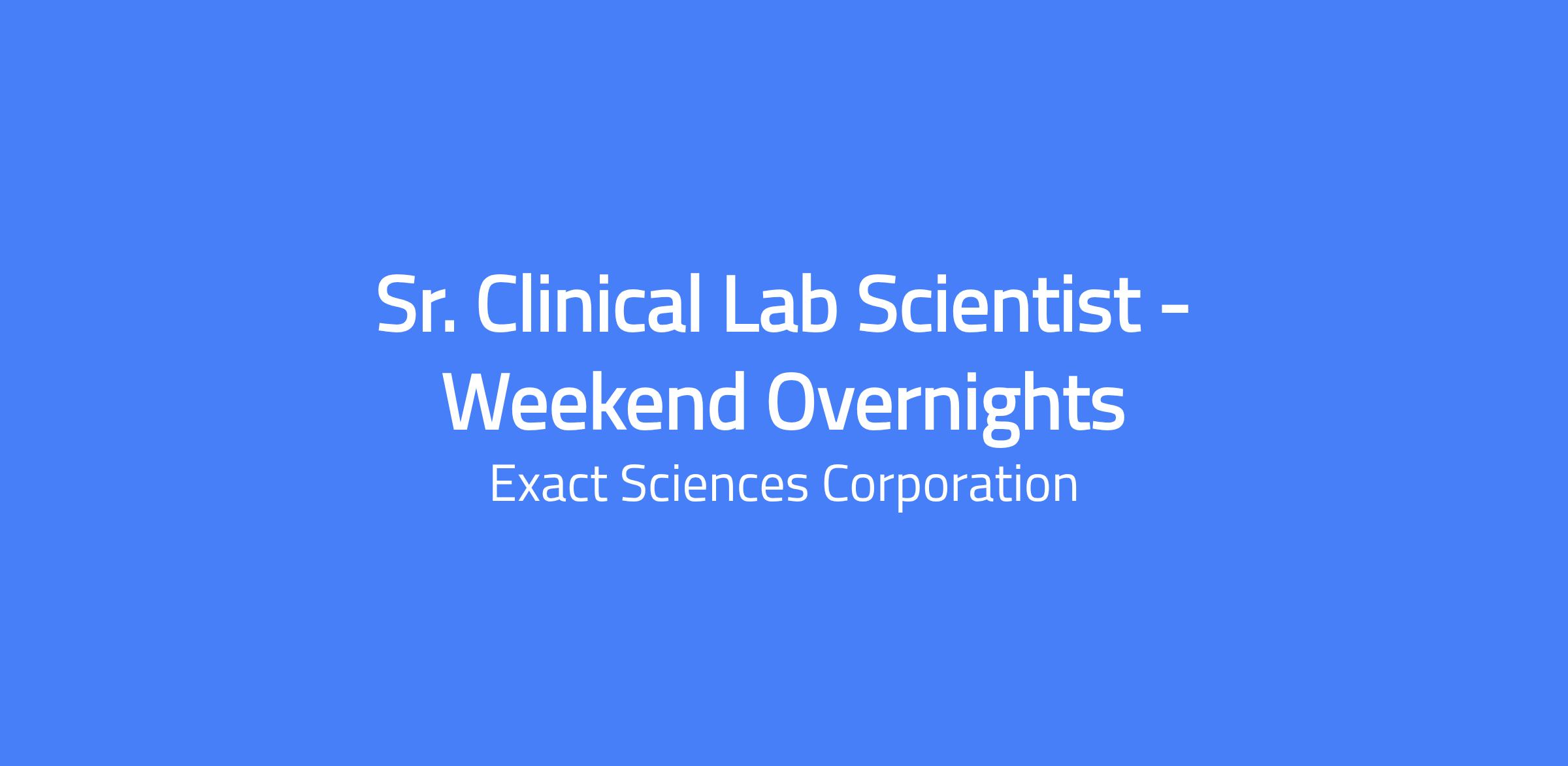 Help us change lives At Exact Sciences, weâre helping change how the world prevents, detects and guides treatment for cancer. We give patients and clinicians the clarity needed to make confident decisions when they matter most. Join our team to find a purpose-driven career, an inclusive culture, and robust benefits to support your life while youâre working to help others. Position Overview The Senior Clinical Laboratory Scientist will be responsible for performing moderate and high complexity laboratory testing on patient specimens, interpreting and reporting patient results, performing quality control and quality assurance procedures, assisting Laboratory Leadership with advanced laboratory duties, and complying with all applicable local, state, and federal laboratory requirements. The Senior Clinical Laboratory Scientist will continually display excellent initiative in all aspects of their work, contribute to projects and discussions in addition to daily laboratory testing and consistently performing to high standards. Leadership is demonstrated in technical troubleshooting of laboratory instrumentation and processes as well as laboratory quality improvements, health and safety, and training of laboratory staff. Shift: Sat - Mon, 6p -630a Essential Duties include but are not limited to: Perform moderate and highly complex laboratory tests, procedures, and analyses according to the laboratoryâs standard operating procedures with minimal supervision. Perform, review, and document laboratory quality control procedures. Identify potential problems, determine potential solutions, and take appropriate action in order to maintain a high level of quality in test processes and results. Achieve and maintain competency on laboratory tasks. Participate in research, validation, and/or implementation of new procedures and/or technologies. Maintain stringent standards for quality, by identifying, investigating, correcting, and documenting any issues which might adversely impact the quality of test results and/or employee safety, and communicating these to the appropriate management representatives as necessary for resolution. Determine appropriate time allocation between daily test processing needs and project needs in a high quality, efficient and effective manner with minimal direction. Demonstrate and maintain effective communication with internal employees, managers, customers, and cross-functional teams. Model behaviors that promote high productivity, quality and maintaining TAT. Uphold company mission and values through accountability, innovation, integrity, quality, and teamwork. Demonstrate adaptability by embracing changes in the laboratory with a positive attitude. Support and comply with the companyâs Quality Management System policies and procedures. Maintain regular and reliable attendance. Act with an inclusive mindset. Work a designated schedule. Ability to work overtime, as needed. Ability to lift up to 40 pounds for approximately 25% of a typical working day. Ability to work seated for approximately 50% of a typical working day. Ability to work standing for approximately 50% of a typical working day. Ability to work on a mobile device, tablet, or in front of a computer screen and/or perform typing for approximately 75% of a typical working day. Ability to perform technical work up to 80% of a typical working day and administrative work up to 20% of a typical working day. Ability to grasp with both hands; pinch with thumb and forefinger; turn with hand/arm; reach above shoulder height. Ability to use various types of laboratory equipment and perform repetitive motions. Ability to comply with any applicable personal protective equipment requirements. Comply with safety and hazard regulations as outlined in the clinical laboratory safety manual. Ability to use near vision to view samples at close range. May be exposed to hazardous materials, tissue specimens, blood or blood products and instruments with moving parts, lasers, heating and freezing elements, and high-speed centrifugation. Observe principles of data security and patient confidentiality. Maintain ethical standards in the performance of testing and in interactions with patients, co-workers, and other health care professionals. Travel between Exact Sciences sites may be required. Perform job duties as expected of a Clinical Laboratory Scientist. Perform training and competency tasks with laboratory personnel on current and new procedures. Provide leadership in daily activities as a shift senior scientist. Assist the laboratory supervisors including, but not limited to, writing, and reviewing procedures, documents, and forms, and assisting in developing the troubleshooting and decision-making skills of the Clinical Laboratory Scientists. Oversee the activities and provide guidance and constructive feedback to clinical laboratory scientists I and II. Ability to recognize deviations from the accepted practice and perform deep root cause analysis. Professional demeanor and behavior in all work-related interactions. Ability to respond to stakeholder requests in a professional and timely manner. Minimum Qualifications Associate degree in a laboratory science (chemical or biological science) or medical laboratory technology from an accredited institution or equivalent laboratory training and experience as defined: 60 semester hours or equivalent from an accredited institution that, at a minimum, includes either 24 semester hours of medical laboratory technology courses, OR 24 semester hours of science courses that include six semester hours of chemistry, six semester hours of biology, and 12 semester hours of chemistry, biology or medical laboratory technology in any combination. 3+ years of high complexity clinical testing experience in a clinical laboratory setting. Demonstrated strong professionalism and leadership skills. Demonstrated intermediate level project management skills. Demonstrated strong technical skills and profe