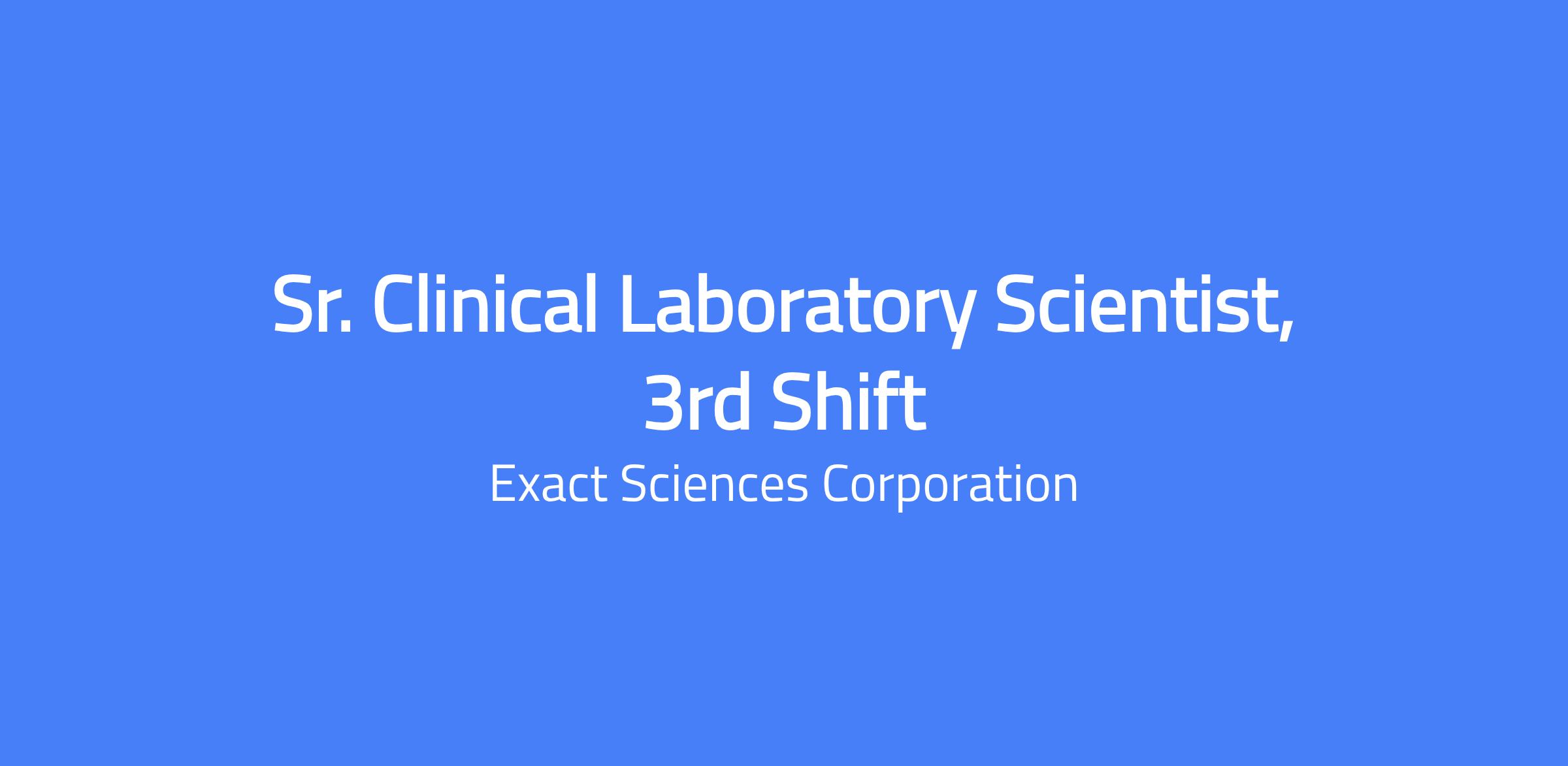 Help us change lives At Exact Sciences, weâre helping change how the world prevents, detects and guides treatment for cancer. We give patients and clinicians the clarity needed to make confident decisions when they matter most. Join our team to find a purpose-driven career, an inclusive culture, and robust benefits to support your life while youâre working to help others. Position Overview The Senior Clinical Laboratory Scientist will be responsible for performing moderate and high complexity laboratory testing on patient specimens, interpreting and reporting patient results, performing quality control and quality assurance procedures, assisting Laboratory Leadership with advanced laboratory duties, and complying with all applicable local, state, and federal laboratory requirements. The Senior Clinical Laboratory Scientist will continually display excellent initiative in all aspects of their work, contribute to projects and discussions in addition to daily laboratory testing and consistently performing to high standards. Leadership is demonstrated in technical troubleshooting of laboratory instrumentation and processes as well as laboratory quality improvements, health and safety, and training of laboratory staff. Shift: Tuesday- Friday 10:00 pm - 7:30 am Essential Duties include but are not limited to: Perform moderate and highly complex laboratory tests, procedures, and analyses according to the laboratoryâs standard operating procedures with minimal supervision. Perform, review, and document laboratory quality control procedures. Identify potential problems, determine potential solutions, and take appropriate action in order to maintain a high level of quality in test processes and results. Achieve and maintain competency on laboratory tasks. Participate in research, validation, and/or implementation of new procedures and/or technologies. Maintain stringent standards for quality, by identifying, investigating, correcting, and documenting any issues which might adversely impact the quality of test results and/or employee safety, and communicating these to the appropriate management representatives as necessary for resolution. Determine appropriate time allocation between daily test processing needs and project needs in a high quality, efficient and effective manner with minimal direction. Demonstrate and maintain effective communication with internal employees, managers, customers, and cross-functional teams. Model behaviors that promote high productivity, quality and maintaining TAT. Uphold company mission and values through accountability, innovation, integrity, quality, and teamwork. Demonstrate adaptability by embracing changes in the laboratory with a positive attitude. Support and comply with the companyâs Quality Management System policies and procedures. Maintain regular and reliable attendance. Act with an inclusive mindset. Work a designated schedule. Ability to work overtime, as needed. Ability to lift up to 40 pounds for approximately 25% of a typical working day. Ability to work seated for approximately 50% of a typical working day. Ability to work standing for approximately 50% of a typical working day. Ability to work on a mobile device, tablet, or in front of a computer screen and/or perform typing for approximately 75% of a typical working day. Ability to perform technical work up to 80% of a typical working day and administrative work up to 20% of a typical working day. Ability to grasp with both hands; pinch with thumb and forefinger; turn with hand/arm; reach above shoulder height. Ability to use various types of laboratory equipment and perform repetitive motions. Ability to comply with any applicable personal protective equipment requirements. Comply with safety and hazard regulations as outlined in the clinical laboratory safety manual. Ability to use near vision to view samples at close range. May be exposed to hazardous materials, tissue specimens, blood or blood products and instruments with moving parts, lasers, heating and freezing elements, and high-speed centrifugation. Observe principles of data security and patient confidentiality. Maintain ethical standards in the performance of testing and in interactions with patients, co-workers, and other health care professionals. Travel between Exact Sciences sites may be required. Perform job duties as expected of a Clinical Laboratory Scientist. Perform training and competency tasks with laboratory personnel on current and new procedures. Provide leadership in daily activities as a shift senior scientist. Assist the laboratory supervisors including, but not limited to, writing, and reviewing procedures, documents, and forms, and assisting in developing the troubleshooting and decision-making skills of the Clinical Laboratory Scientists. Oversee the activities and provide guidance and constructive feedback to clinical laboratory scientists I and II. Ability to recognize deviations from the accepted practice and perform deep root cause analysis. Professional demeanor and behavior in all work-related interactions. Ability to respond to stakeholder requests in a professional and timely manner. Minimum Qualifications Associate degree in a laboratory science (chemical or biological science) or medical laboratory technology from an accredited institution or equivalent laboratory training and experience as defined: 60 semester hours or equivalent from an accredited institution that, at a minimum, includes either 24 semester hours of medical laboratory technology courses, OR 24 semester hours of science courses that include six semester hours of chemistry, six semester hours of biology, and 12 semester hours of chemistry, biology or medical laboratory technology in any combination. 3+ years of high complexity clinical testing experience in a clinical laboratory setting. Demonstrated strong professionalism and leadership skills. Demonstrated intermediate level project management skills. Demonstrated strong technical s